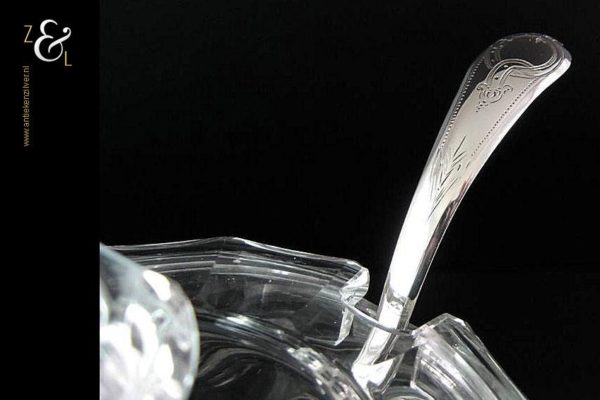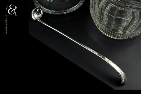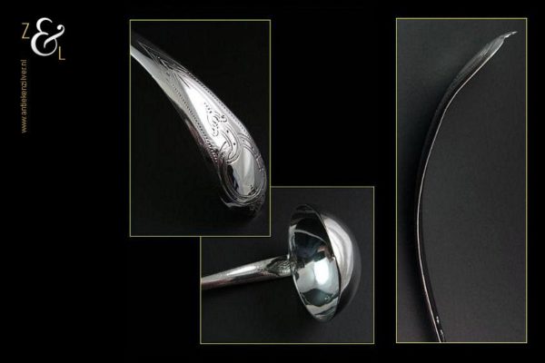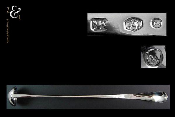 Boerenjongenslepel gemaakt in Arnhem door Manikus & Verhoef (meesterteken MV in achthoek) in het jaar 1884 (jaarletter Z). Deze zilveren boerenjongenslepel weegt 45 gram en is 29.5 cm lang de diameter van de bak is 3.9 cm. (In het handvat zit een klein knikje zie foto).