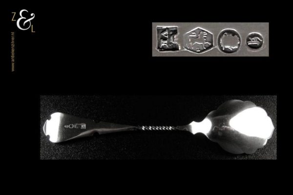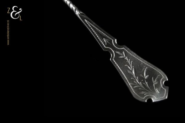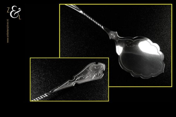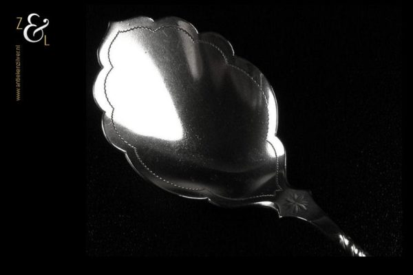 Bonbonlepel gemaakt in Voorschoten door de Fa. J.M. van Kempen & Zonen (meesterteken liggend maantje tussen punten boven VK in vierkant) in het jaar 1892 (jaarletter H). Deze gematteerde (matteren is een bewerking waarbij de zilversmid het oppervlak van een zilveren voorwerp een matte structuur geeft) en gegraveerde zilveren Jugendstil bonbonlepel weegt 22 gram en is 15.2 cm lang.