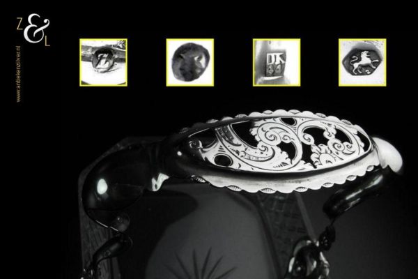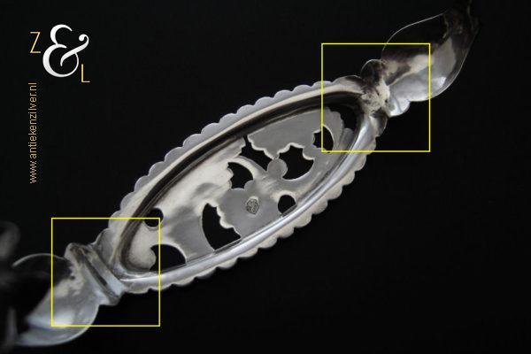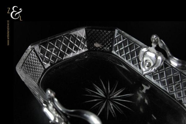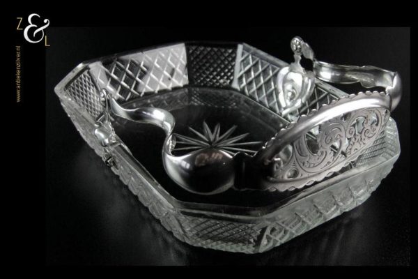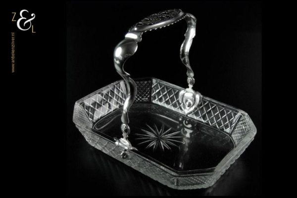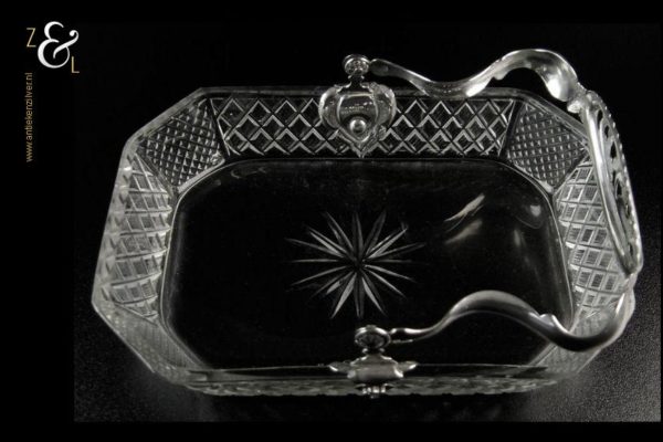 Van dit in Biedermeier stijl uitgevoerde bonbonschaaltje is het zilveren montuur (hengsel) gemaakt in Den Bosch / ‘s-Hertogenbosch door Antonius Hendrikus der Kinderen (meesterteken DK boven 44 in vierkant) in het jaar 1859 (jaarletter Z). Het zilveren s-vormige hengsel heeft aan de bovenzijde een geschulpt uitgezaagd en met c-vormige voluten gegraveerd handvat. Het achtkantige kristallen schaaltje is op de hand gevormd, geslepen met een ruitpatroon en daarna gepolijst. Aan de onderzijde van het schaaltje is een ster geslepen. Het bonbonschaaltje weegt 416 gram is 16.9 cm lang en 11.8 cm breed en met het hengsel omhoog 12 cm hoog. Het hengsel heeft aan de binnenkant op twee plaatsen een kleine niet storende restauratie (versteviging). Zie foto met geel omkaderd gedeelte.