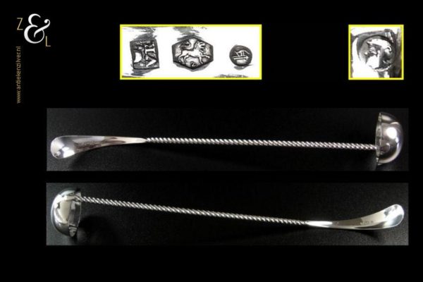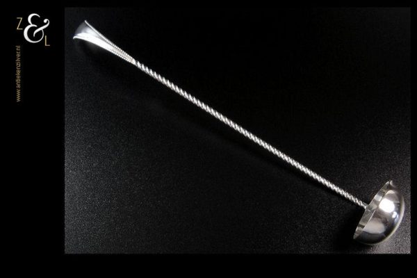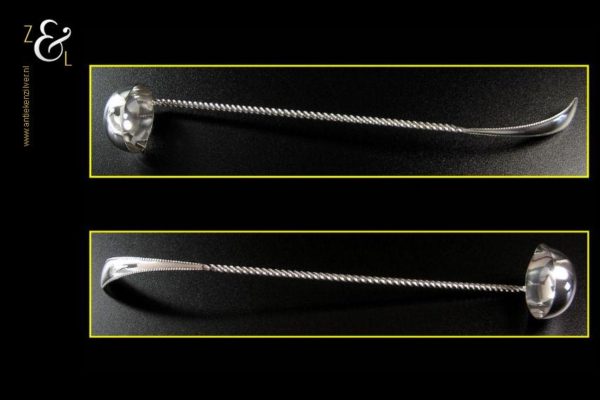 Bowllepel gemaakt in Voorschoten door de Fa. J.M. van Kempen & Zonen (meesterteken liggend maantje tussen punten boven VK in vierkant) in het jaar 1892 ( jaarletter H). Deze zware zilveren bowllepel met getordeerde steel en handvat met parelrand weegt 66 gram is 31 cm lang en de diameter van de bak (met schenktuit) meet 4.5 cm.