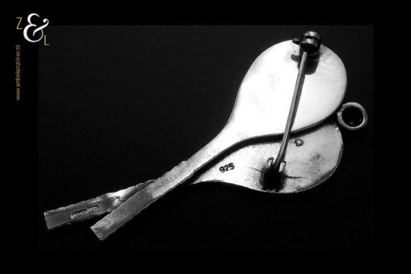Deze broche met twee gekruiste tennisrackets plus bal is in de zeventiger jaren gemaakt en stamt vermoedelijk uit Engeland (meesterteken MGL in rechthoek). De zilveren broche die voorzien is van een afsluitbare speld is gekeurd met het zilverkeur 925 voor eerste gehalte (Sterling) zilver, weegt 9 gram en is 5.5 cm lang 2.5 cm breed.