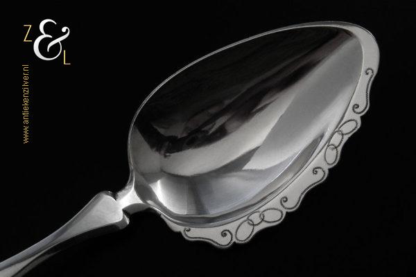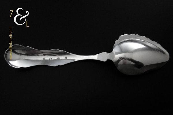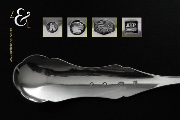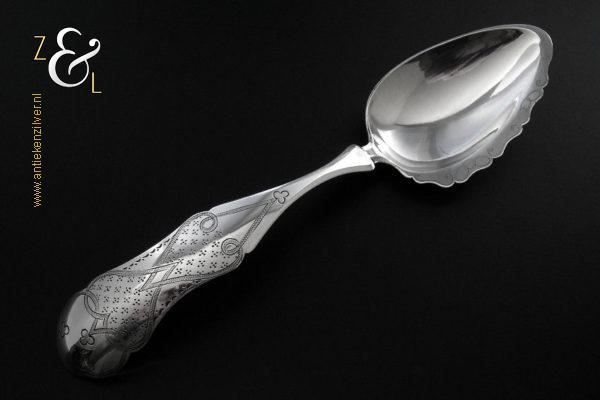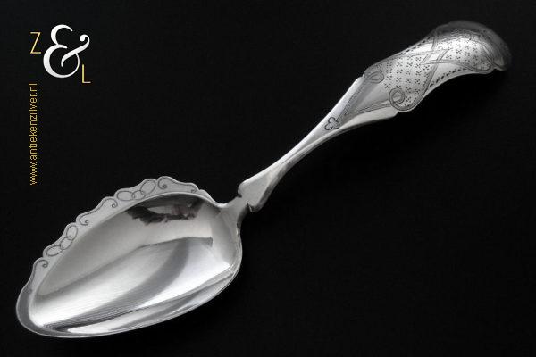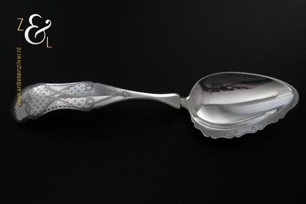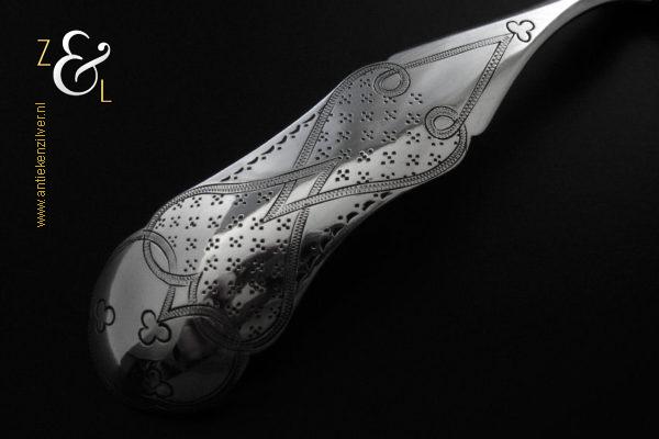 Deze compotelepel is gemaakt in Schoonhoven door Arie de Pater (meesterteken A.P. boven lepel in vierkant) in het jaar 1869 (jaarletter K). De zilveren Biedermeier compotelepel die fijntjes gegraveerd is weegt 51 gram en is 21.8 cm lang. De lepelbak is 8 cm lang bij 5.2 cm breed.