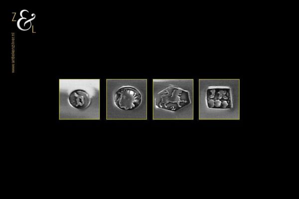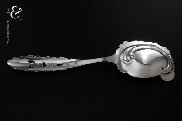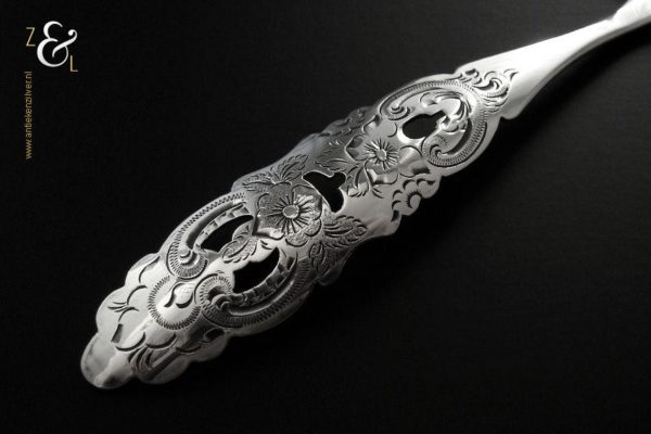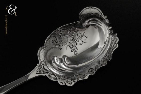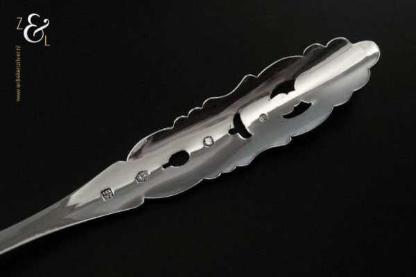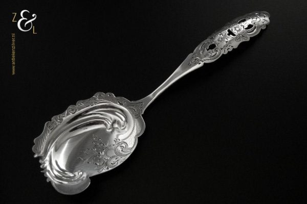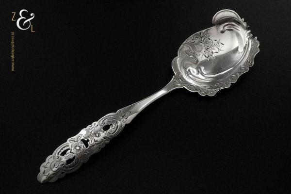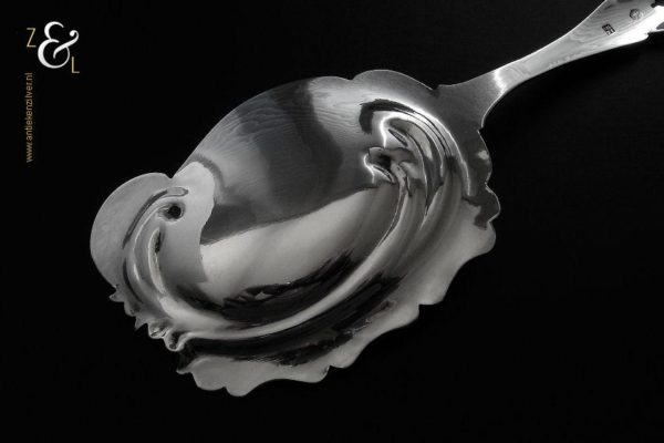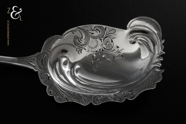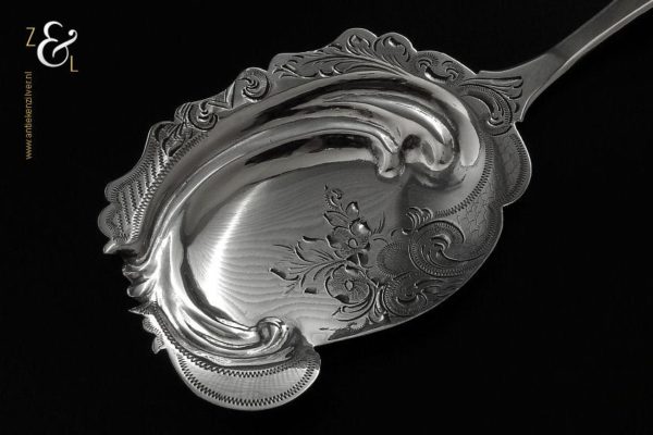 Deze dienlepel is gemaakt in Schoonhoven door Jacob van der Ree (meesterteken JR boven 125 in vierkant) in het jaar 1863 (jaarletter D). De op de hand gedreven en uitgezaagde zilveren Biedermeier dienlepel heeft een steel en lepelbak die zijn gegraveerd met c-vormige voluten en bloemmotieven. De dienlepel weegt 39 gram en is 20.1 cm lang. De lepelbak is 7.2 cm lang bij 5 cm breed.