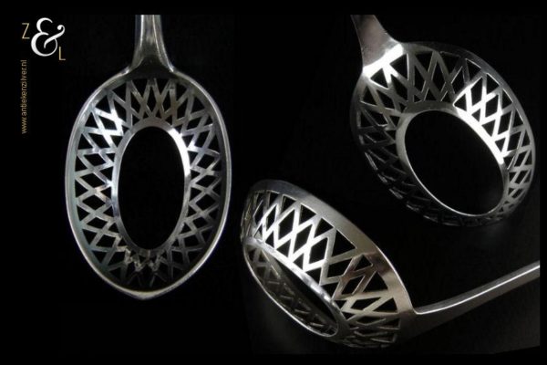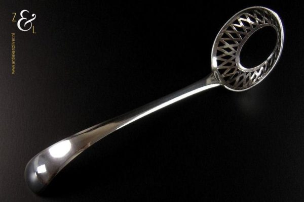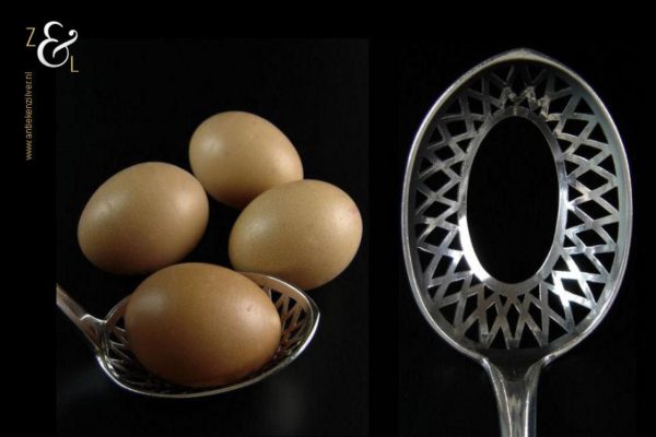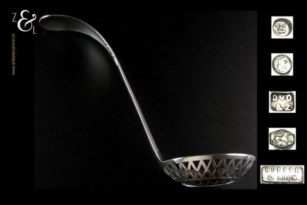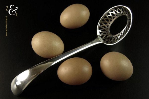 Eierlepel gemaakt in Amsterdam door Daniël Outvorst (meesterteken DVO boven &Z in achthoek) in het jaar 1906 (jaarletter W). Deze zilveren Art Deco eierlepel is verkocht bij de firma Hoeker & Zoon (zie afgeslagen winkeliersmerk) heeft een uitgezaagde bak met pastillemotief en een lange gladde steel, weegt 69 gram is 22 cm lang en de bak meet 5.3 cm x 7.5 cm.