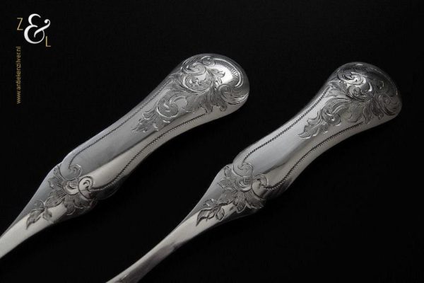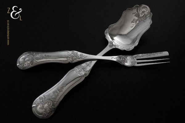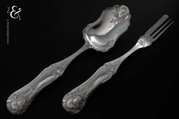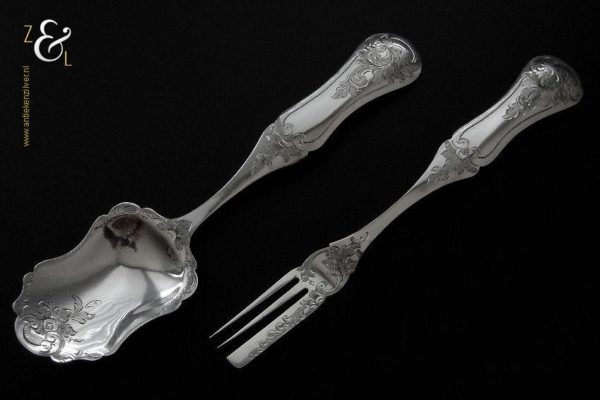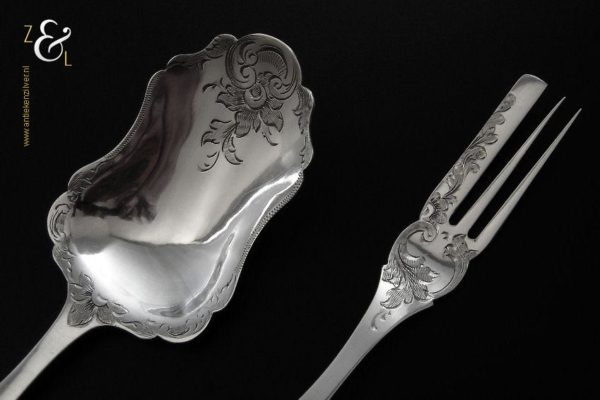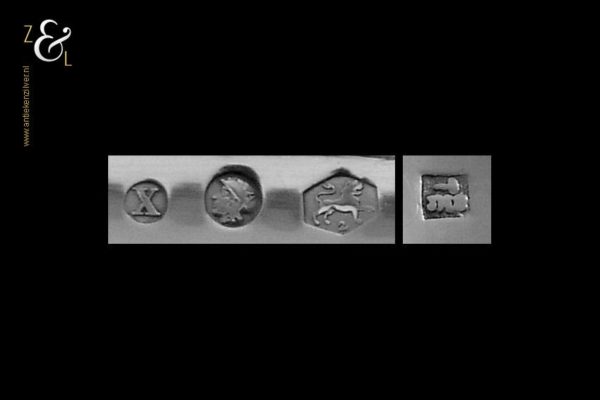Gembercouvert gemaakt in Amsterdam door Jacob Hendrik Schouten (meesterteken hamer boven JHS in vierkant) in het jaar 1857 (jaarletter X). Dit in Biedermeier uitgevoerde zilveren gembercouvert heeft een gravering van c-vormige voluten. Het gembercouvert weegt 58 gram en is 19.6 cm lang. De royale lepelbak is 7 cm lang en 4.5 cm breed.
