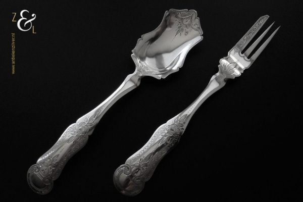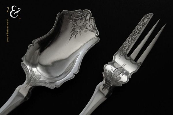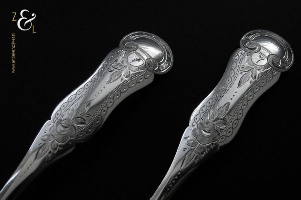 Gembercouvert gemaakt in Voorschoten bij de Firma J.M. van Kempen & Zonen (meesterteken liggend maantje boven VK in vierkant) in het jaar 1877 (jaarletter S). Dit in Biedermeier uitgevoerde zilveren gembercouvert heeft een gravering van bloem- en bladmotieven en c-vormige voluten. Het gembercouvert weegt 62 gram en is 19.3 cm lang.