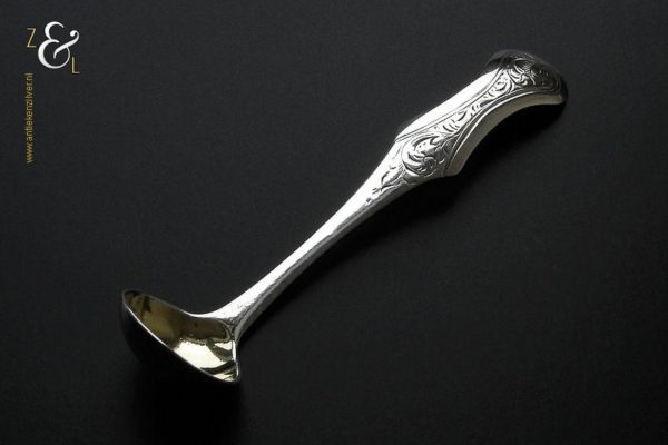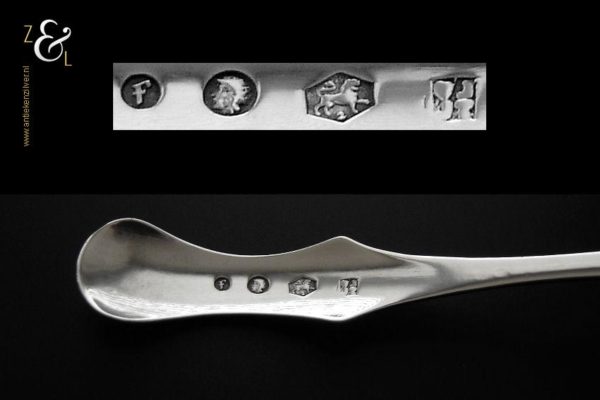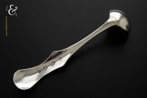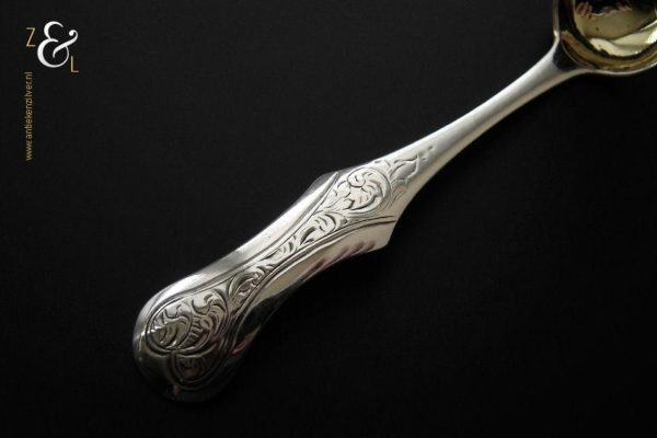 Mosterdlepel gemaakt in Amsterdam door Johannes Jacobus Torlau (meesterteken hartje J boven J T in vierkant) in het jaar 1865 (jaarletter F). Deze zilveren Biedermeier mosterdlepel waarvan de binnenbak verguld is heeft een met c-vormige voluten gegraveerd handvat. De mosterdlepel weegt 12 gram en is 9.5 cm lang. De bak heeft een diameter van 2.2 cm.