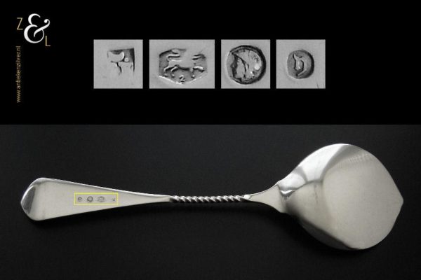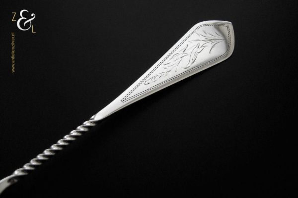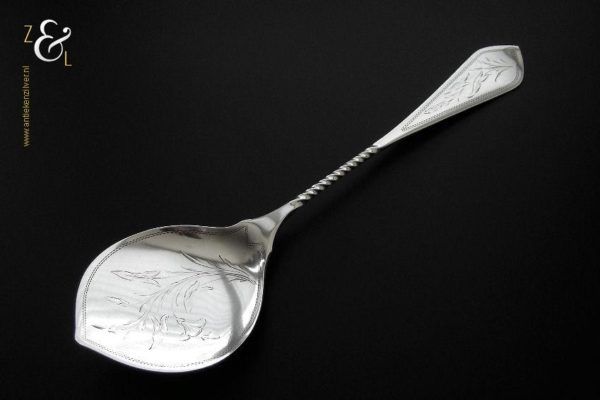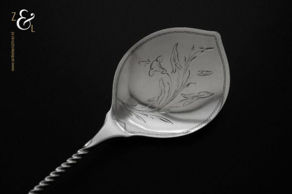Deze petitfourschep is gemaakt in Voorschoten door de Firma J.M. van Kempen & Zonen (meesterteken liggend maantje tussen punten boven VK in vierkant) in het jaar 1883 (jaarletter Y). De zilveren Neostijl petitfourschep heeft een getordeerde steel en zowel het handvat als de schep zijn fijntjes gegraveerd met blad- en bloemmotieven. De petitfourschep weegt 49 gram en is 21.4 cm lang. Het schepgedeelte is 7.5 cm lang bij 6 cm breed.