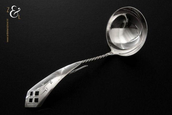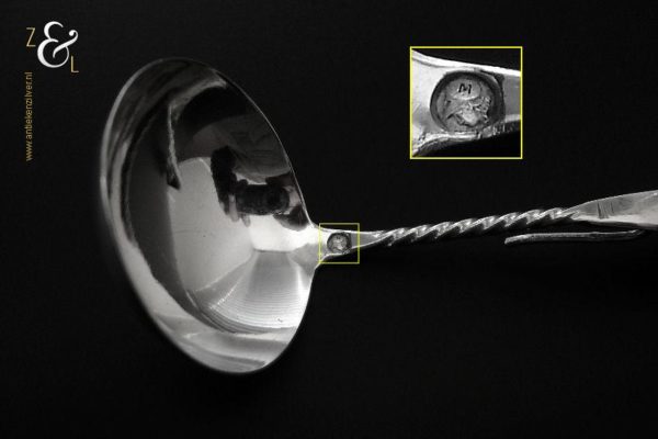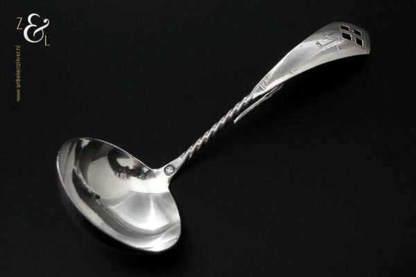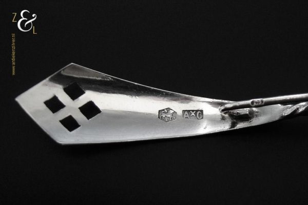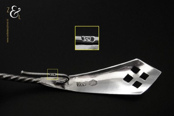 Deze roomlepel is vermoedelijk gemaakt / verkocht in Den Haag door de Firma Alter & Co (meesterteken AxC in rechthoek) in het jaar 1926 (jaarletter Q). De roomlepel heeft het Minerva waarborgkantoor stempel met aanduidende letter M voor Schoonhoven. De zilveren Art Deco roomlepel heeft een getordeerde steel met haak en een gegraveerd uitgezaagd handvat. De roomlepel weegt 13 gram en is 11.5 cm lang. De lepelbak heeft een diameter van 3.9 cm.