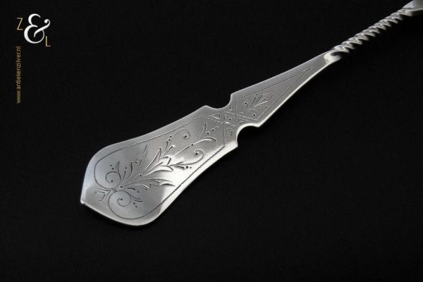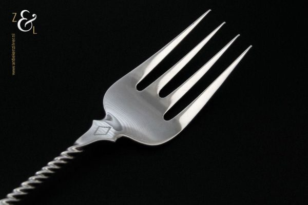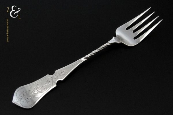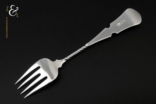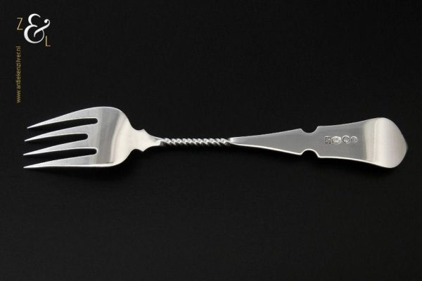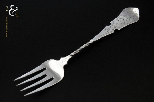 Deze sardienvork / sardinevork / broodvork / cakevork is gemaakt in Voorschoten door de Firma J.M. van Kempen & Zonen (meesterteken liggend maantje tussen punten boven VK in vierkant) in het jaar 1888 (jaarletter D). De zilveren vork heeft een getordeerde steel en een mooi gevormd handvat dat sierlijk gegraveerd is. De vork weegt 27 gram en is 16.6 cm lang.