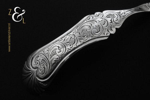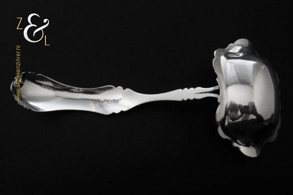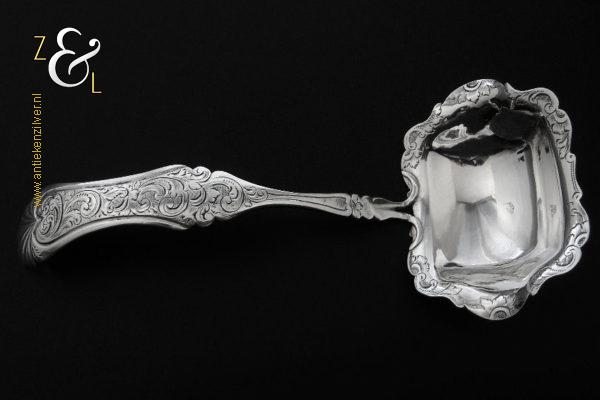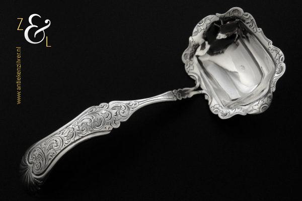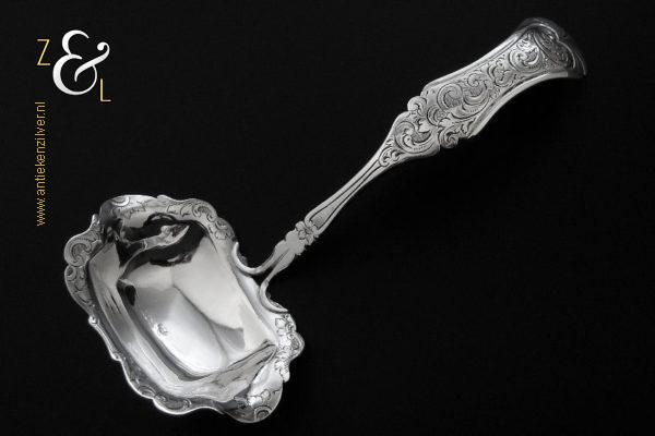 Deze sauslepel is gemaakt in Amsterdam door Jacob van Wijk jr. (meesterteken JvW onder vis in vierkant) in het jaar 1852 (jaarletter S). De zilveren Biedermeier sauslepel heeft een gecontourneerde lepelbak die gegraveerd is met bloemmotieven en c-vormige voluten. De steel en handvat hebben een diepe gravering van c-vormige voluten. Tevens is het uiteinde van het handvat uitgevoerd met een schelpmotief. De sauslepel weegt 52 gram en is 17.2 cm lang. De rechthoekige lepelbak is 7.5 cm lang bij 5.6 cm breed.