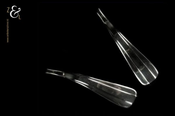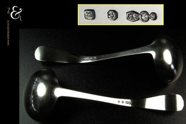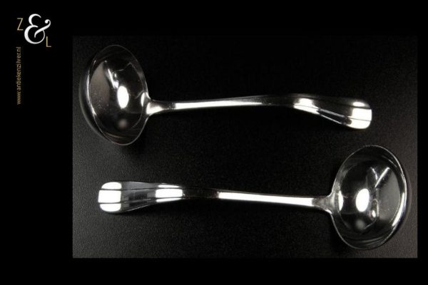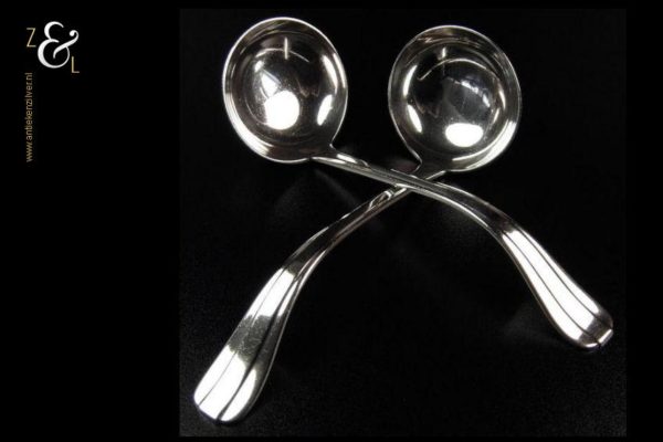 Dit stel sauslepels ontworpen door Christa Ehrlich (de lepels dragen tevens haar eigen meesterteken CE in een vierkant) is gemaakt in Voorschoten door de Zilverfabriek Voorschoten N.V. (meesterteken V boven liggend maantje in achthoek) in het jaar 1947 (jaarletter M). Deze zware en in model 1064 uitgevoerde zilveren sauslepels wegen samen 150 gram zijn 17 cm lang de bakken hebben een diameter van 5.5 cm.