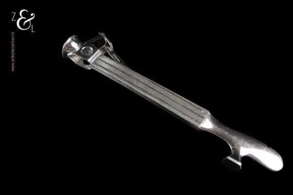 Deze sigarenknipper heeft aan het uiteinde een lepel waarmee men uit een pijp de verbruikte tabak kan verwijderen en een stamper waarmee men tabak in een pijp kan aanstampen (men kan er ook sigarenkisten mee openen en weer afsluiten). De sigarenknipper met stalen knipper en met zilveren montuur is in Duitsland geproduceerd en stamt uit de vijftiger jaren, hij is gestempeld met het zilverkeur 830 dat staat voor 830/1000 2e gehalte zilver en met de afkorting ges. gesch. dat voor gesetzlich geschützt* staat. De sigarenknipper is 16.7 cm lang en weegt 76 gram.