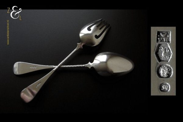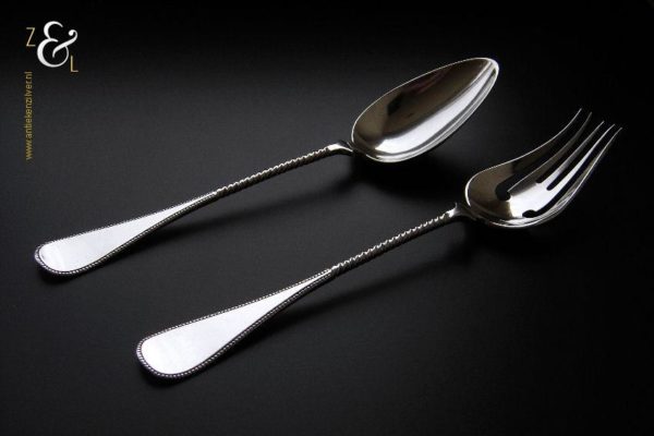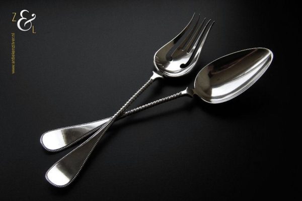 Sladiencouvert gemaakt in Voorschoten bij de Firma J.M. van Kempen & Zonen (meesterteken liggend maantje tussen punten boven VK in vierkant) in het jaar 1897 (jaarletter N). Dit zilveren Jugendstil sladiencouvert heeft getordeerde stelen en is uitgevoerd met parelrand. Het sladiencouvert weegt 198 gram is 25 cm lang en de lepelbak en vork zijn 9 cm lang en 5 cm breed.
