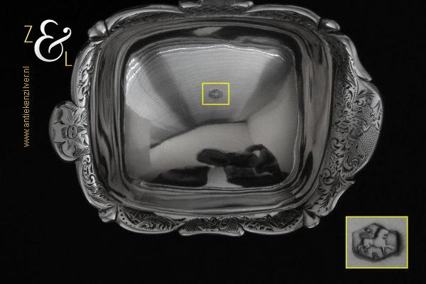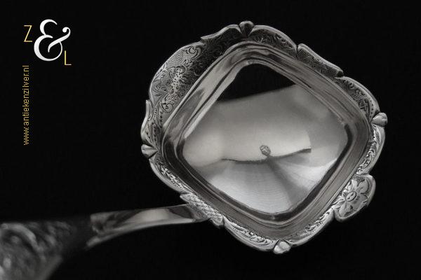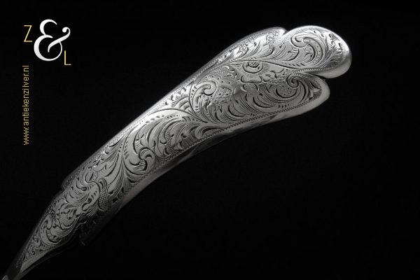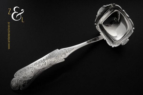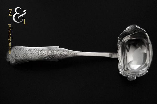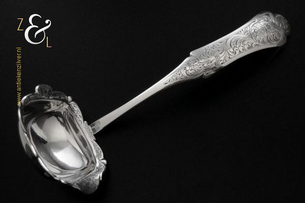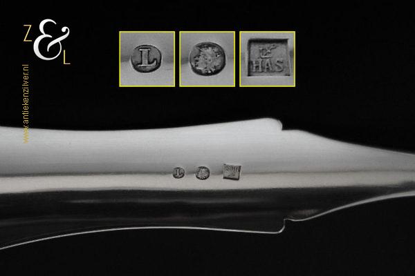 Deze soepdienlepel / sauslepel / ragoutlepel is gemaakt in Amsterdam door H.A. Schuss (meesterteken HAS onder anker in vierkant) in het jaar 1845 (jaarletter L). De zilveren Biedermeier soepdienlepel / sauslepel / ragoutlepel heeft een gecontourneerde lepelbak die gegraveerd is met bloem- en bladmotieven. Leuk detail is dat op de schenklip van de lepelbak een gestileerde haan is gegraveerd (zie laatste afbeelding). Het handvat is uitgevoerd met een diepe gravering van c-vormige voluten. De soepdienlepel / sauslepel / ragoutlepel weegt 111 gram en is 23.3 cm lang. De rechthoekige lepelbak is 8.5 cm lang bij 6.5 cm breed.