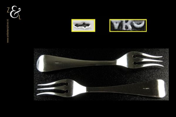 Dit stel belegvorken / stel zuurvorken is gemaakt in Voorschoten door de Firma J.M. van Kempen & Zonen (meesterteken VK liggend maantje in rechthoek) tussen de jaren 1906 en 1924 (gekeurd met het zilverkeur zwaardje). De zilveren Art Nouveau belegvorken / zuurvorken die uitgevoerd zijn met een parelrand wegen 36 gram en zijn 12.8 cm lang.