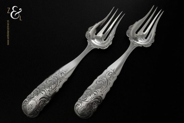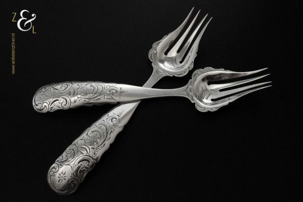 Dit stel belegvorken / stel zuurvorken is gemaakt in Amsterdam door Gerardus Wilhelmus Uriot (meesterteken GU onder ster in vierkant) in het jaar 1854 (jaarletter U). De royale zilveren Biedermeier belegvorken / zuurvorken waarvan de handvatten een diepe gravering van c-vormige voluten hebben wegen 59 gram en zijn 16.8 cm lang.