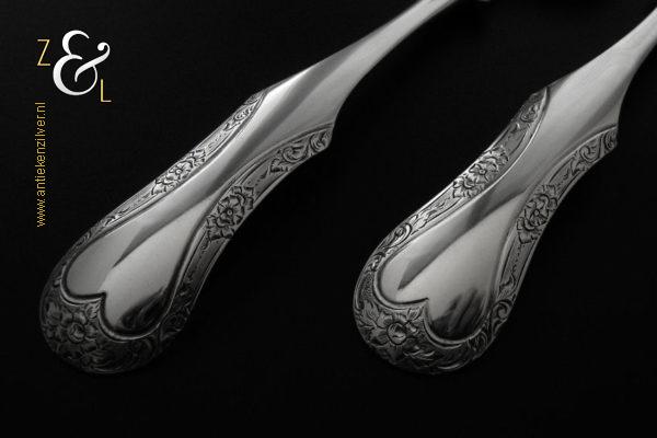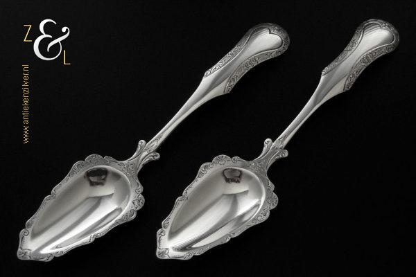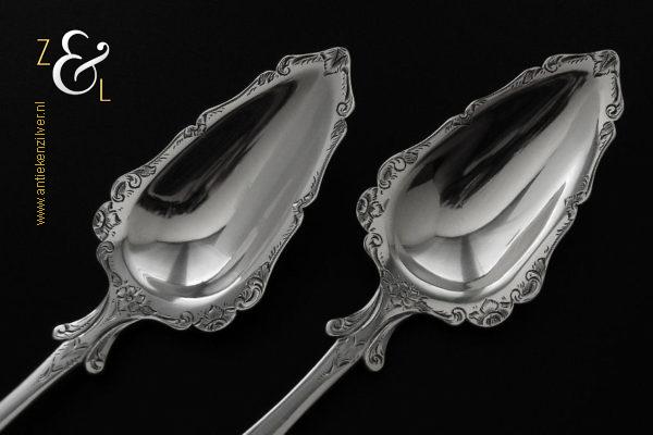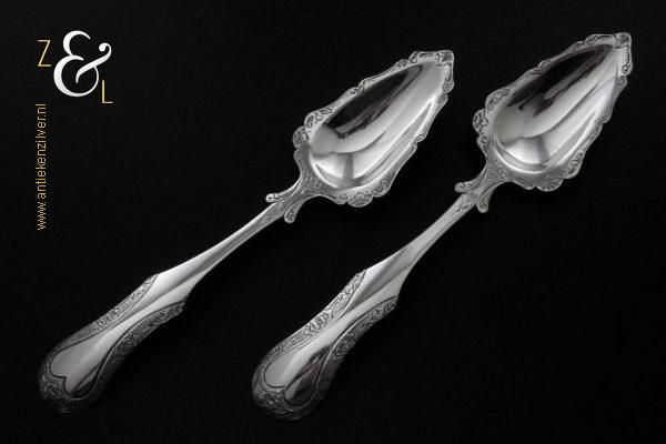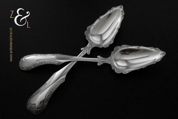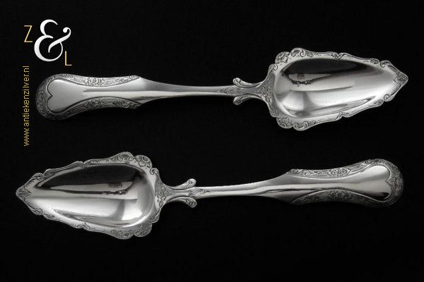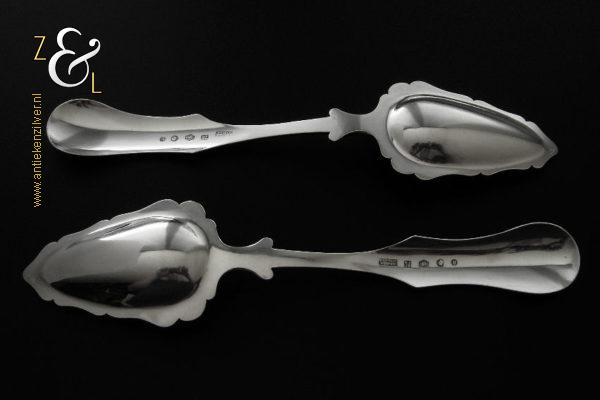 Dit stel compotelepels is gemaakt in Amsterdam door Johannes Jacobus Torlau (meesterteken hartje J boven J T in vierkant) in het jaar 1860 (jaarletter A). Tevens draagt dit stel compotelepels het winkeliersmerk van Benten & Zonen. De zilveren Biedermeier compotelepels hebben een diepe gravering van c-vormige voluten en bloemmotieven. De stelen zijn gegraveerd met een hartmotief. De compotelepels wegen samen 82 gram en zijn 20.8 cm lang. De lepelbakken zijn 7.6 cm lang bij 4.6 cm breed.
