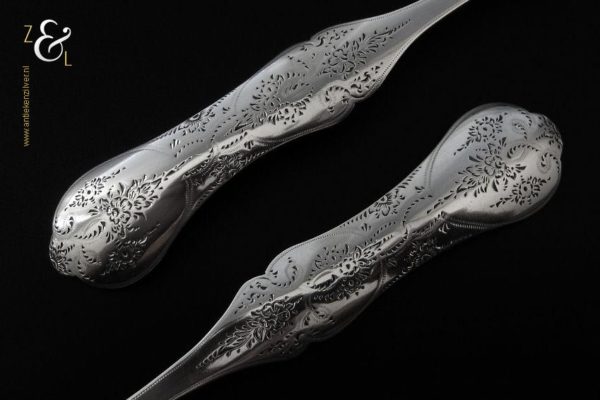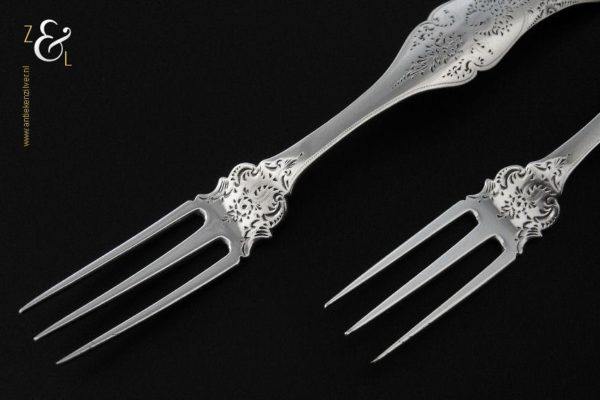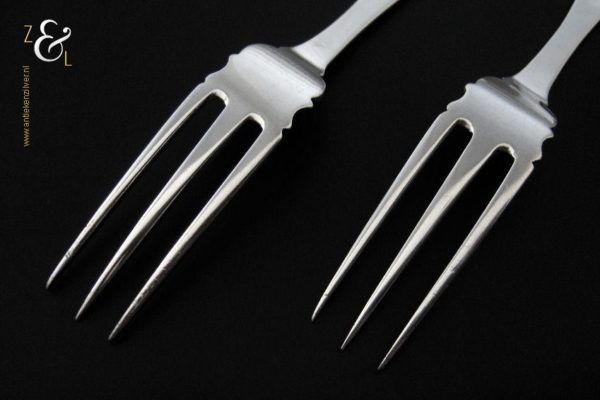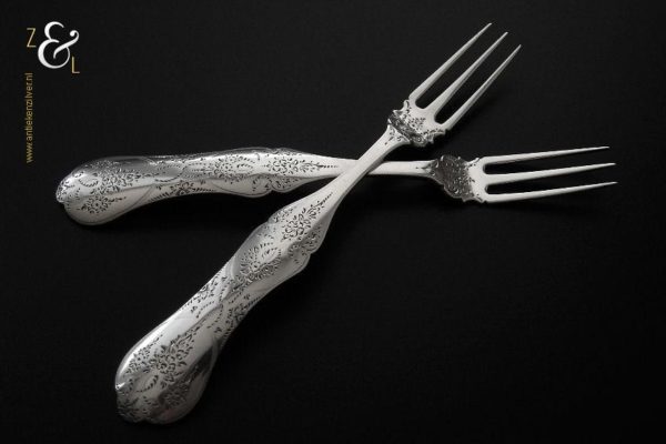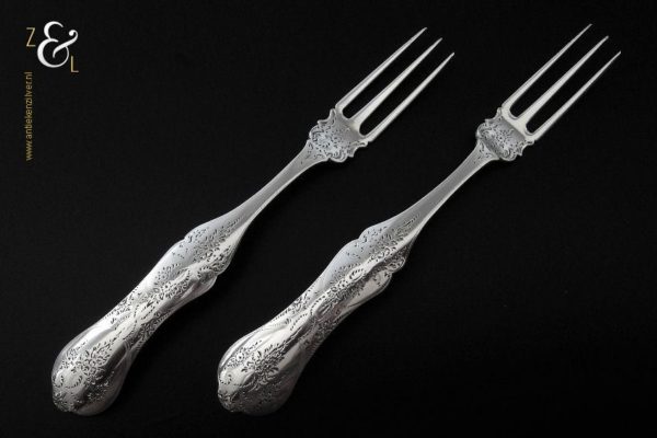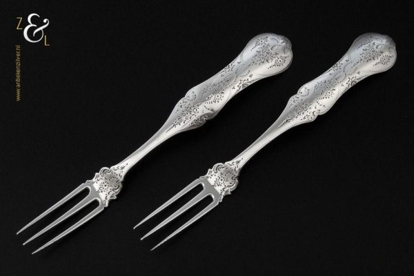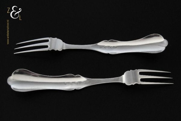 Dit stel dessertvorken / stel fruitvorken is gemaakt in Amsterdam door Theodorus Lambertus Uriot (meesterteken aambeeld boven FLU in vierkant) in het jaar 1864 (jaarletter e). De zilveren Biedermeier dessertvorken / fruitvorken zijn fijntjes gegraveerd wegen 45 gram en zijn 17 cm lang. De vorken hebben lichte gebruikssporen aan de vorkpunten.