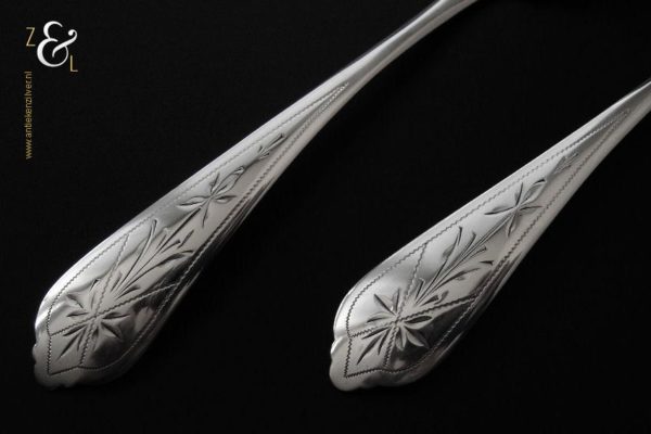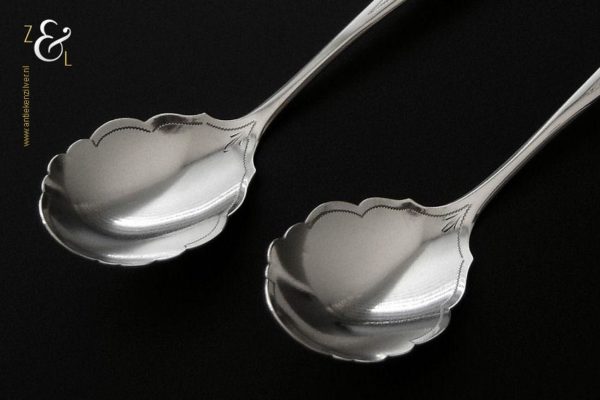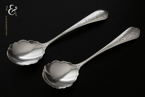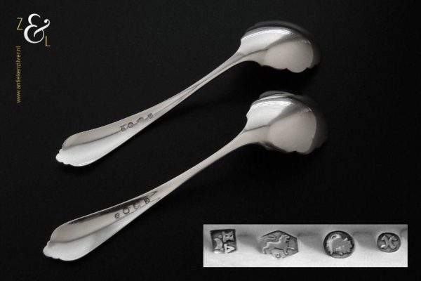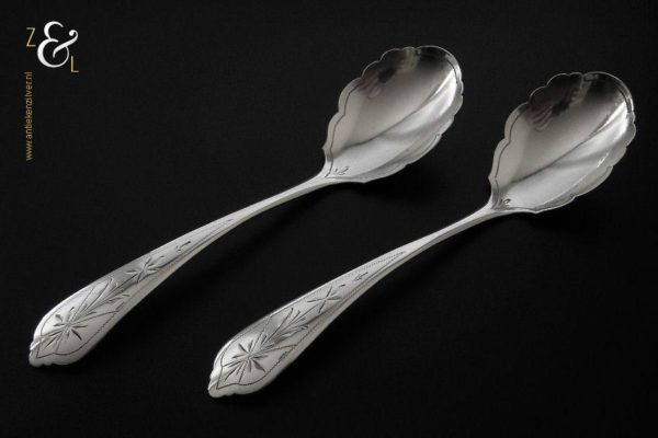 Dit stel jamlepels / confiturenlepels is gemaakt in Voorschoten door de Firma J.M. van Kempen & Zonen (meesterteken liggend maantje tussen punten boven VK in vierkant) in het jaar 1882 (jaarletter X). Het stel zilveren jamlepels / confiturenlepels hebben stelen die fijntjes gegraveerd zijn met een stermotief. De geschulpte lepelbakken zijn licht gematteerd (matteren is een bewerking waarbij de zilversmid het oppervlak van een zilveren voorwerp een matte structuur geeft) en zijn 5 cm lang bij 3.8 cm breed. Het stel zilveren jamlepels / confiturenlepels wegen 49 gram en zijn 15.6 cm lang.