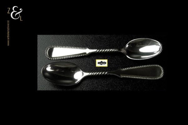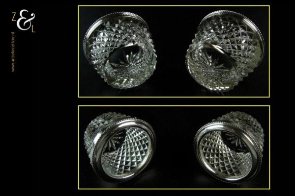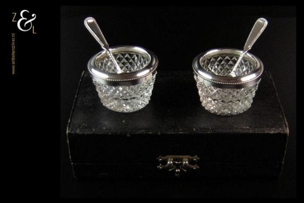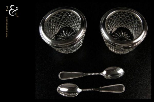 Dit in parelrand uitgevoerde stel Hollandse kristallen zoutvaatjes met zilveren monturen en bijbehorende zilveren zoutlepels bevindt zich nog in het originele foedraal. De kristallen zoutvaatjes zijn uitgevoerd in ruitslijpsel met op de bodem een ster. De zilveren monturen zijn net zoals de zilveren zoutlepels gekeurd met een meesterteken (niet goed leesbaar) en met het zwaardje (dit is het gehaltemerk voor kleine zilveren werken). De afmetingen van de zoutvaatjes zijn 3.5 cm hoog en hebben een diameter van 5.4 cm, zij wegen 140 gram. De lepeltjes zijn 7.5 cm lang en zij wegen 7 gram.