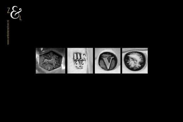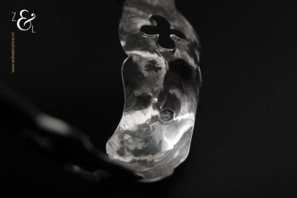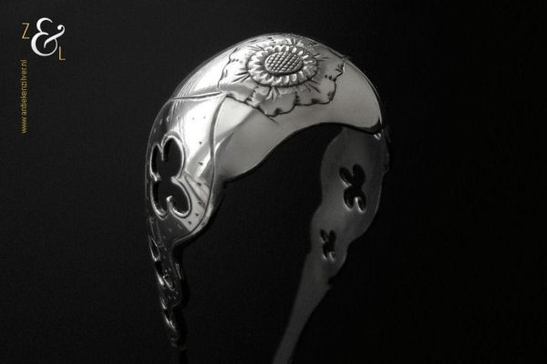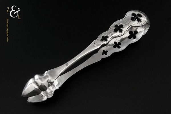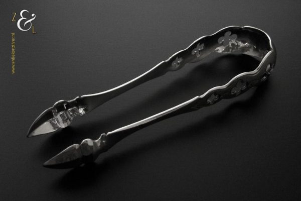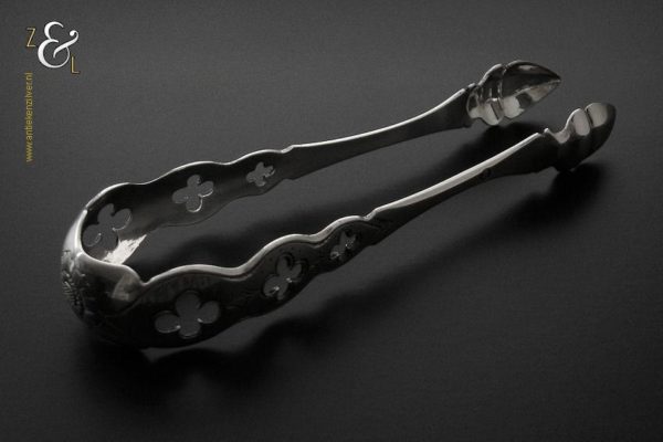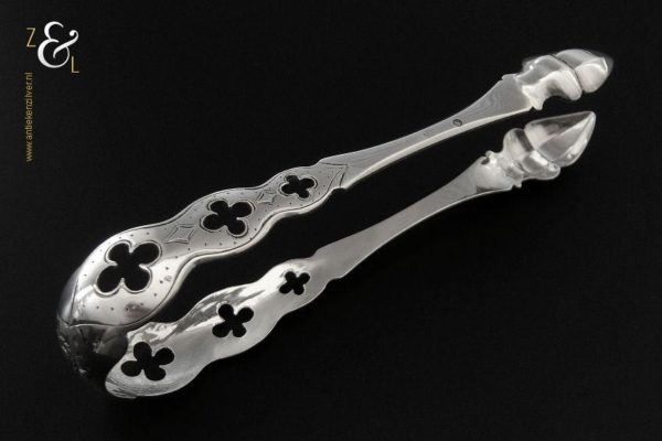 Deze suikerklontjestang / kandijtang is gemaakt in Den Bosch / ‘s-Hertogenbosch door Antonius Hendrikus der Kinderen (meesterteken DK boven 44 in vierkant) in het jaar 1855 (jaarletter V). De zilveren Biedermeier suikerklontjestang / kandijtang is gegraveerd met een bloemmotief en de stelen zijn uitgezaagd in een klaverviermotief. De tang weegt 33 gram en is 14 cm lang. Aan de binnenzijde van de handgesmede tang kan men de hamerslagen zien waarmee de zilversmid de tang gevormd heeft.