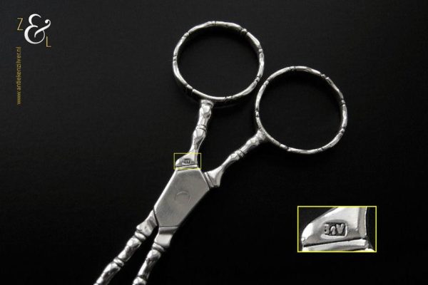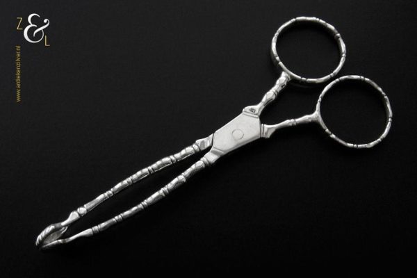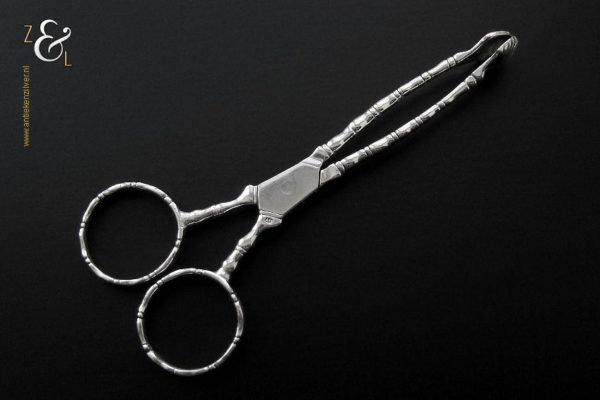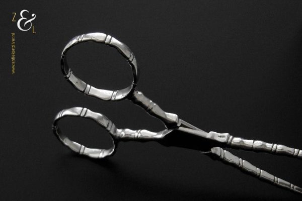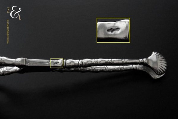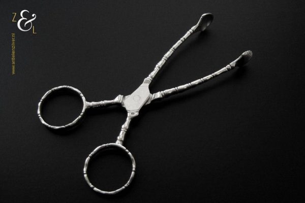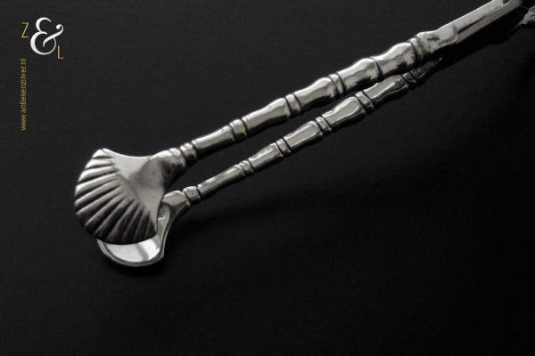 Deze suikerklontjestang / kandijtang is gemaakt in Steenwijk door J.H.W. Visser & H.R. Bijkamp (Firma M. Bijkamp & Co.) (meesterteken B1V in rechthoek) tussen 1925 en1942 (gekeurd met het zilverkeur zwaardje). De zilveren Art Deco suikerklontjestang / kandijtang is uitgevoerd in een bamboemotief en heeft schelpen als bak. De suikerklontjestang / kandijtang weegt 25 gram en is 11 cm lang.