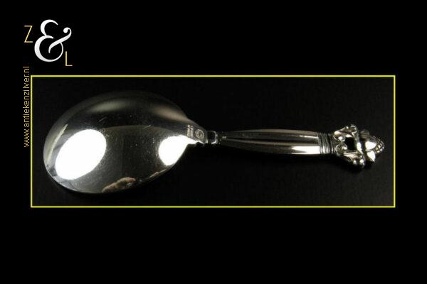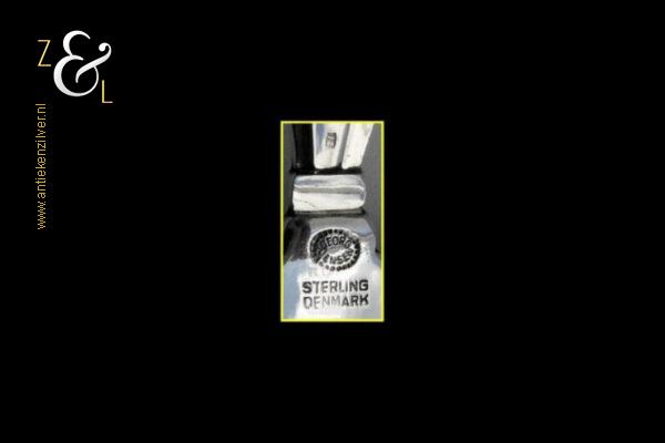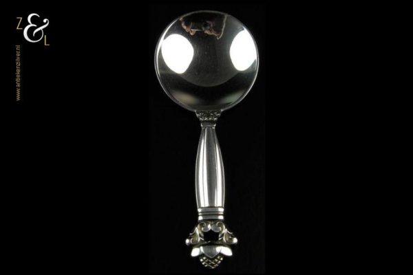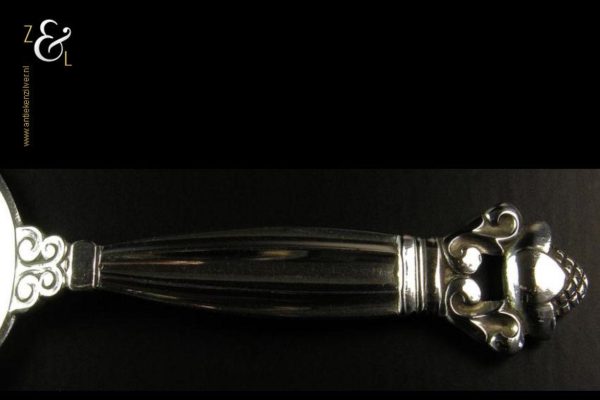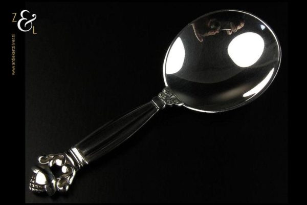 Deze suikerschep (uitgevoerd in het Acorn model ontworpen door Johan Rohde in 1915) is gemaakt in Kopenhagen Denemarken bij de wereldberoemde zilversmederij van Georg Jensen (meesterteken GEORG JENSEN in gestippeld ovaal) dit meesterteken was in gebruik na 1945. Tevens is deze suikerschep gekeurd met het Nederlandse gehaltemerk ZI voor voorwerpen in voltooide staat aangeboden en het merk STERLING DENMARK beide een aanduiding voor eerste gehalte zilver. De suikerschep weegt 25 gram is 10.1 cm lang en de lepelbak heeft een diameter van 4 cm.