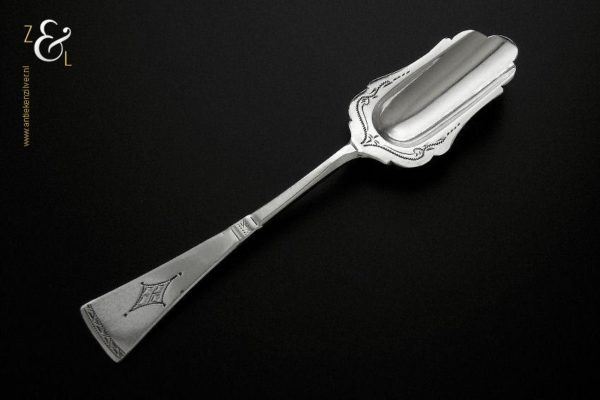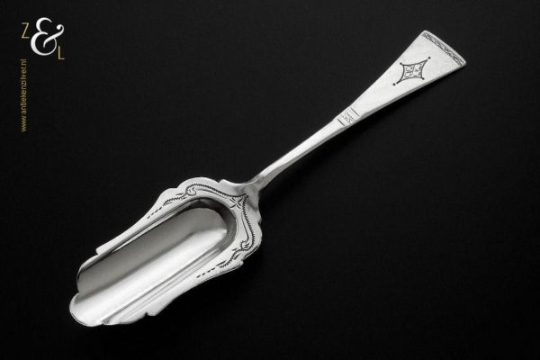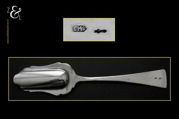Suikerschep gemaakt in Amsterdam door G. Huisman (meesterteken GH2 in zeshoek) tussen de jaren 1906 en 1927 (gekeurd met het zilverkeur zwaardje). De zilveren Art Deco suikerschep heeft een fijne gravering en een licht gematteerd handvat (matteren is een bewerking waarbij de zilversmid het oppervlak van een zilveren voorwerp een matte structuur geeft). De suikerschep weegt 12 gram en is 12.7 cm lang. De suikerschep heeft lichte gebruikssporen.