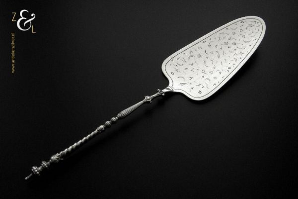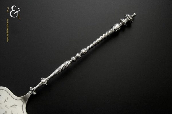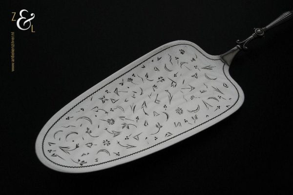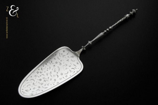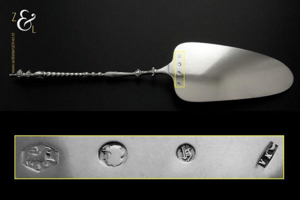 Deze taartschep is gemaakt in Voorschoten door de Firma J.M. van Kempen & Zonen (meesterteken VK liggend maantje in rechthoek) in het jaar 1892 (jaarletter H). De zilveren taartschep heeft een gegoten steel met torenknopje en een schepgedeelte gegraveerd met diverse symbolen. De schep weegt 59 gram en is 23.5 cm lang. Het schepgedeelte is 10.3 cm lang bij 5.1 cm breed.