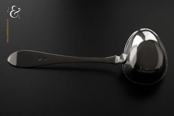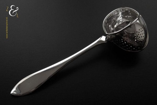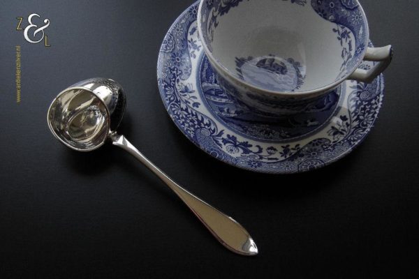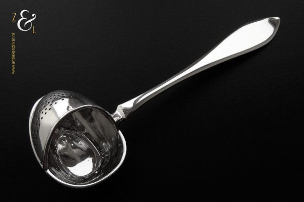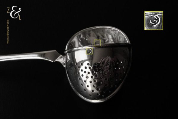 Theezeeflepel gemaakt in Sneek Friesland door de Firma Johan Schijfsma / J. Schijfsma / A.M. Sustring & J. Schijfsma (meesterteken JS boven III in vierkant) in het jaar 1916 (jaarletter G). Deze zwaar uitgevoerde zilveren theezeeflepel model puntfilet weegt 66 gram en is 17.1 cm lang. De bak is 5.8 cm lang bij 4.5 cm breed. Het kantoorstempel van Leeuwarden “Minerva” is in de bak gestempeld en daardoor moeilijk te fotograferen (zie foto). De theekop is ter decoratie.