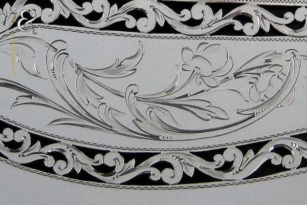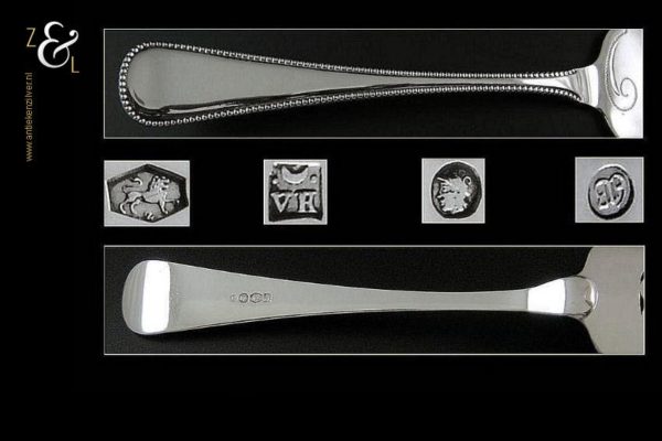 Van deze met parelrand uitgevoerde zilveren Jugendstil visdienschep / visschep is het gematteerde middenstuk (matteren is een bewerking waarbij de zilversmid het oppervlak van een zilveren voorwerp een matte structuur geeft) elegant gegraveerd en fijntjes uitgezaagd. De schep weegt 119 gram is 30.7 cm lang en het schepgedeelte meet 7.4 cm bij 17 cm.