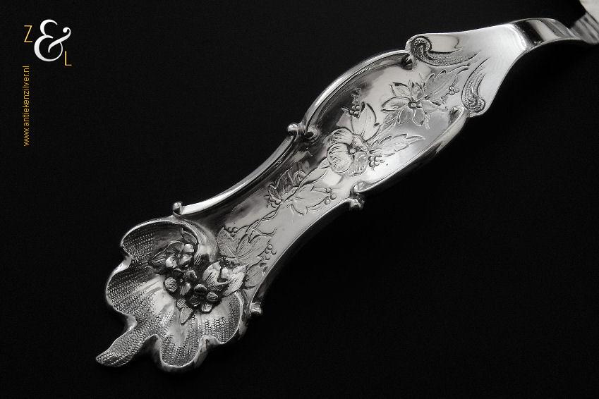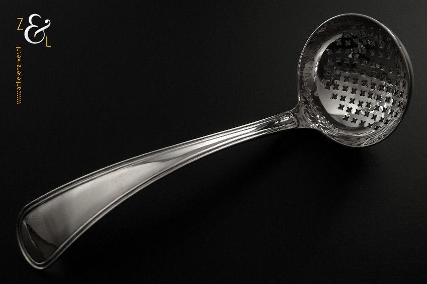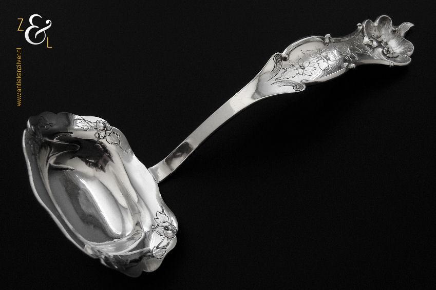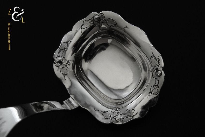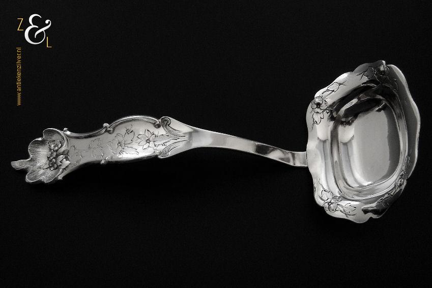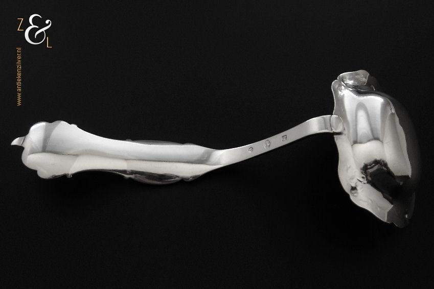 Sauslepel gemaakt in Rotterdam door Pieter Zöllner & Willem Nicolaas Beijder (meesterteken Z&B boven XX in vierkant) in het jaar 1855 (jaarletter V). De zilveren Biedermeier sauslepel heeft een gegoten steel en gedreven lepelbak die voorzien is van gegraveerde bloemmotieven, rocailles, c-vormige voluten en drie hoog gedreven verschillende soorten bloemen op een gegranuleerde ondergrond. De sauslepel weegt 48 gram en is 17.6 cm lang. De lepelbak is 7 cm lang bij 5.5 cm breed.