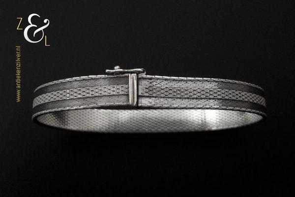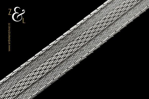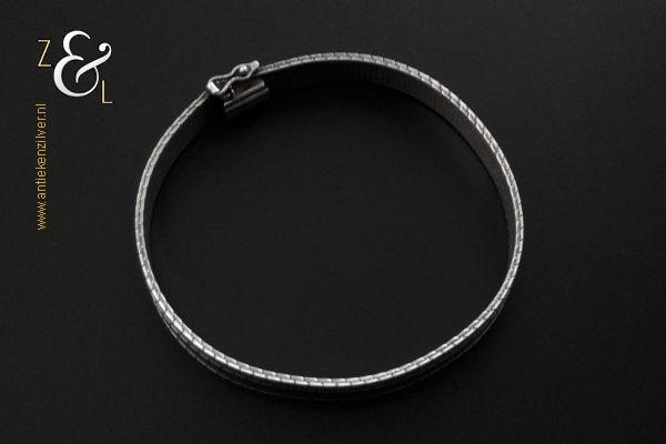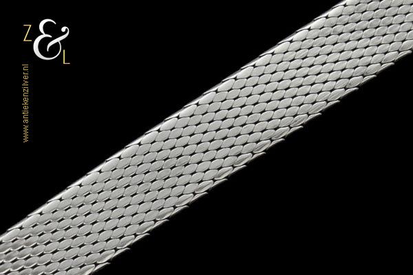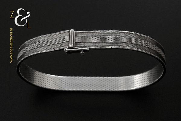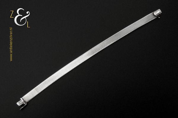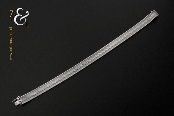 Deze platte gevlochten armband is gemaakt in Pforzheim Duitsland bij de zilversmederij van Andreas Daub (meesterteken A*D / A sterretje D) in de zestiger / zeventiger jaren. De massief zilveren armband met veiligheidsslot draagt het zilverkeur 925 wat staat voor eerste gehalte zilver. Tevens is de armband in Nederland gekeurd met het zilverkeur ZI voor eerste gehalte zilver en het merk voor aanhangsels dit is het merk voor werken van goud of zilver met aanhangsels gebruikt van 1905 tot heden. De armband weegt 21 gram en is 18.6 cm lang bij 0.8 cm breed.