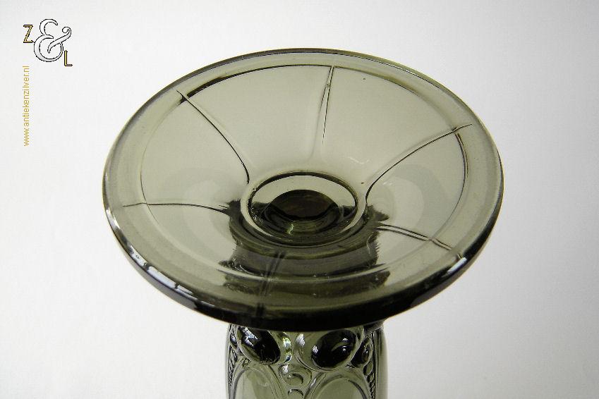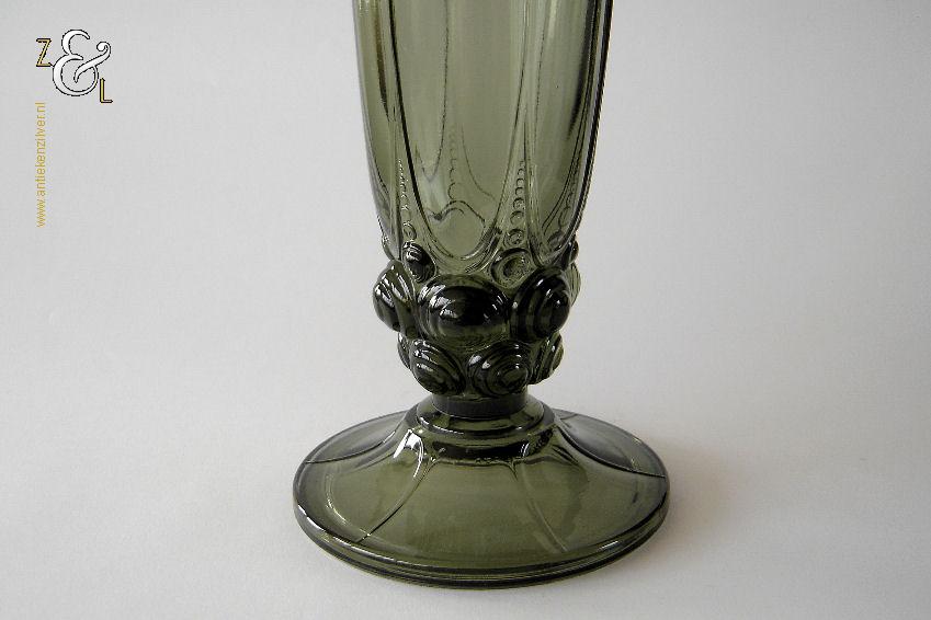 Deze groene Art Deco vaas model “Nummer 39” is in 1935 gemaakt bij de glasfabriek van Luxval te België. De persglazen vaas is aan de onderzijde gesigneerd met “Val St Lambert Belgique” weegt 1551 gram is 31.2 cm hoog en heeft aan de bovenzijde een diameter van 13 cm en aan de onderzijde een diameter van 12.8 cm.