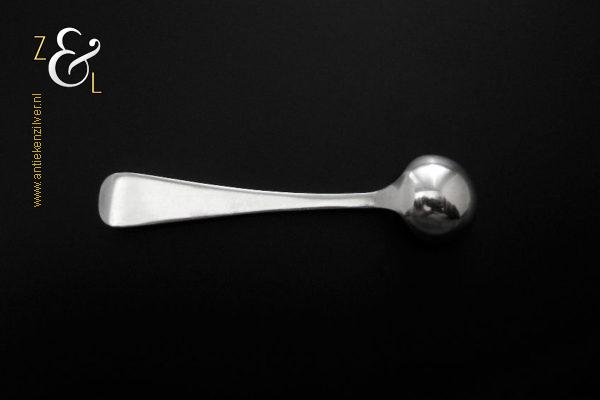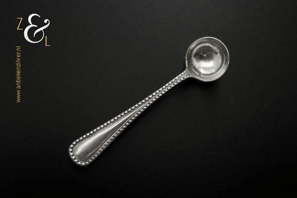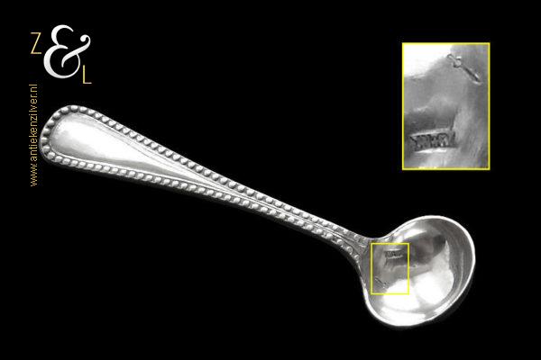 Deze zoutlepel / mosterdlepel is gemaakt in Haarlem bij de Zilversmederij W. Burger (meesterteken W+B in zeskantige rechthoek) tussen 1925 en 1947 gekeurd met het zilverkeur zwaardje (dit is het gehaltemerk voor kleine zilveren werken) dat tussen 1906 en 1953 in gebruik was. De in parelrand uitgevoerde zilveren zoutlepel / mosterdlepel weegt 5 gram en is 6 cm lang.