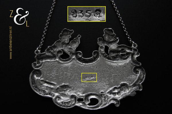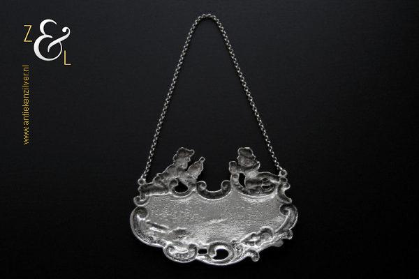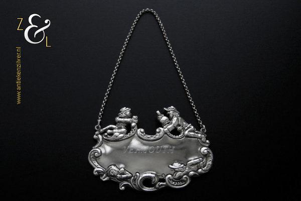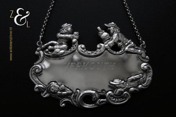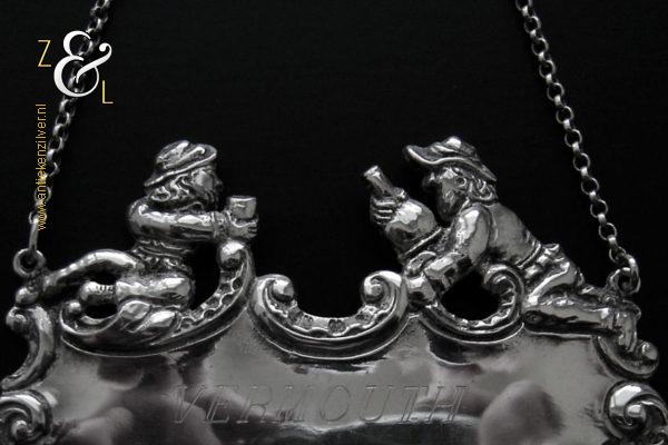 Deze karafhanger / decanteerlabel met ketting en het opschrift Vermouth is in het buitenland gemaakt (vermoedelijk Engeland) en stamt uit de tachtiger jaren. De karafhanger / decanteerlabel in de stijl van de Hugh Johnson* barbenodigdheden collectie is gekeurd met het zilverkeur 835 voor tweede gehalte zilver. De karafhanger / decanteerlabel weegt 19 gram en is 7.1 cm lang bij 5 cm breed.