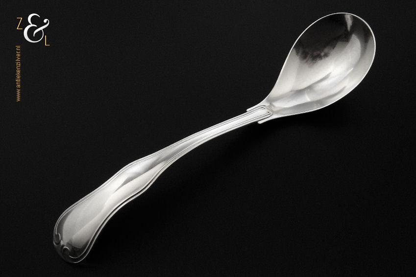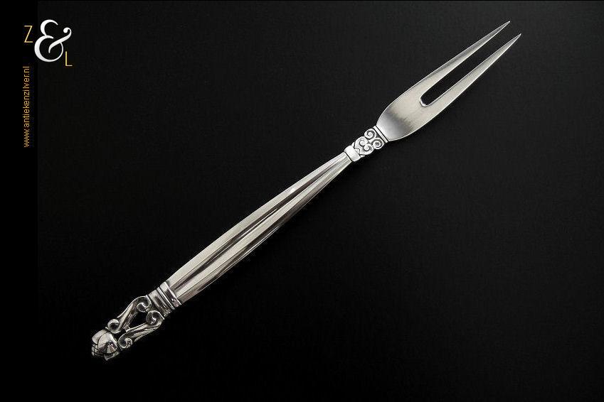 Deze sardienvork / sardinevork is gemaakt in Schoonhoven door Adrianus Kuijlenburg (meesterteken AK boven * 47 in vierkant) in het jaar 1889 (jaarletter E). De zilveren vork heeft een getordeerde steel en een gegraveerde vis als handvat. De vork weegt 25 gram en is 17.8 cm lang.