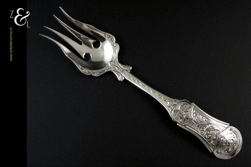 Deze belegvork / zuurvork is gemaakt in Schoonhoven door Anthonie & Jacobus Johannes Driesen (meesterteken A J boven D. in vierkant) in het jaar 1880 (jaarletter V). De stevige zilveren Biedermeier belegvork / zuurvork is gegraveerd met blad- en bloemmotieven. De belegvork / zuurvork weegt 17 gram en is 15.7 cm lang.