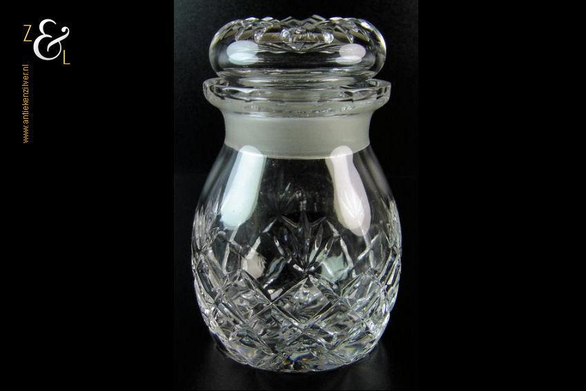 Deze theebus in de vorm van een cilinder is gemaakt in Nederland en stamt uit de eerste helft van de 20e eeuw. De in Art Deco stijl en in helder kristal vervaardigde theebus is mondgeblazen, handgeslepen en gepolijst met op de stop een stermotief en op de bus lange verticale lijnen met daartussen horizontale lijnen en olijven. De theebus weegt 336 gram heeft een diameter van 7 cm en is 13.8 cm hoog. De theebus heeft gebruikssporen (lichte krasjes aan de onderzijde) en de stop heeft twee héél kleine schilfertjes aan de stop zie geel omkaderd gedeelte op afbeelding.