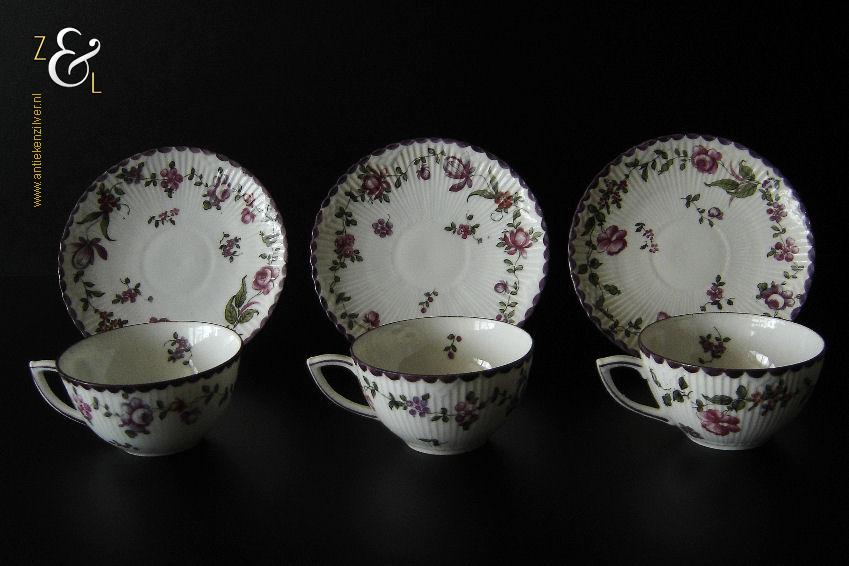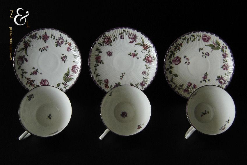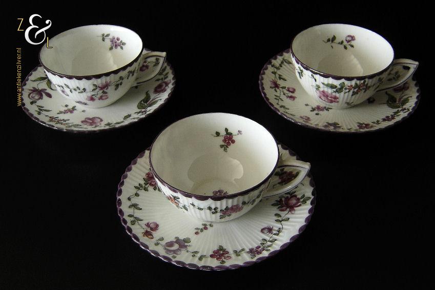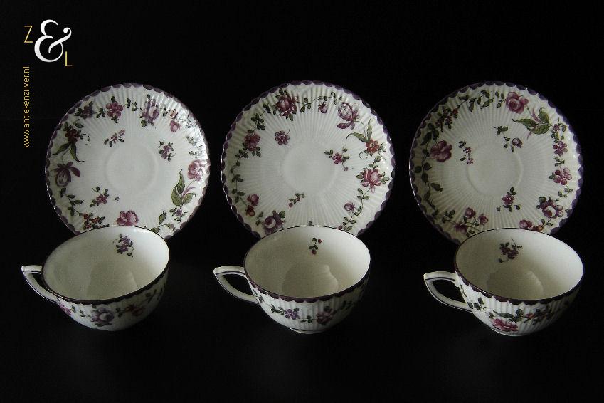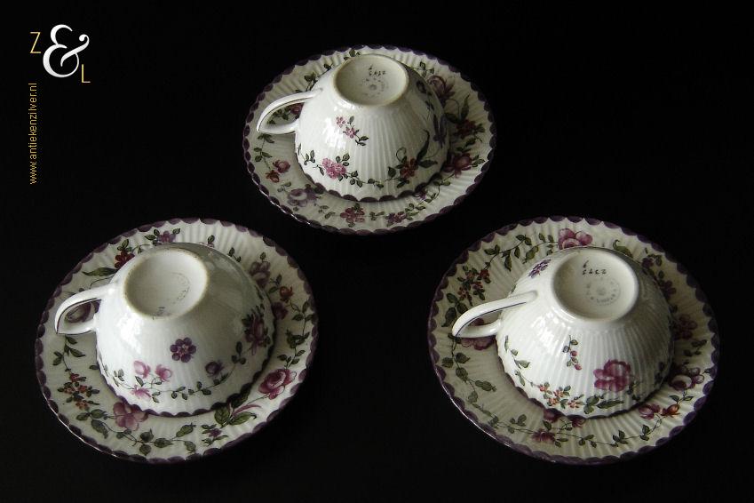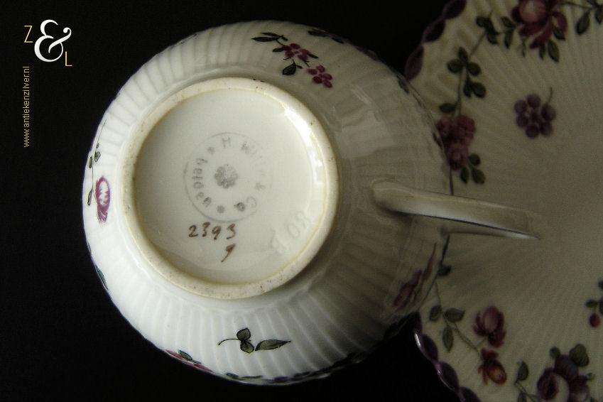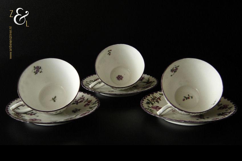 Deze drie kop en schotels zijn verkocht door H. Wille & Co. een winkel gespecialiseerd in de verkoop van galanterieën, pendules, glas en porselein die omstreeks 1880 gevestigd was op de Nieuwendijk 184 in Amsterdam. De porseleinen kop en schotels zijn aan het begin van de 20e eeuw omstreeks 1900 gemaakt en zijn op de hand beschilderd met verschillende decors van bloemen. De kop en schotels zijn met uitzondering van één schotel aan de onderzijde gemerkt met het ronde stempel van H. Wille & Co met daaronder Leiden, het modelnummer 2393 en het blindmerk 80 B. De kopjes zijn 4.7 cm hoog, hebben een diameter van 8.4 cm en zijn inclusief oor gemeten 10.5 cm breed. De schotels hebben een diameter van 13.7 cm en zijn 1.5 cm hoog. Één schotel met daarop één kopje meet 5.2 cm hoog. De drie kop en schotels wegen samen 453 gram. De drie kop en schotels waarvan het model onderling iets afwijkt hebben héél lichte gebruikssporen.