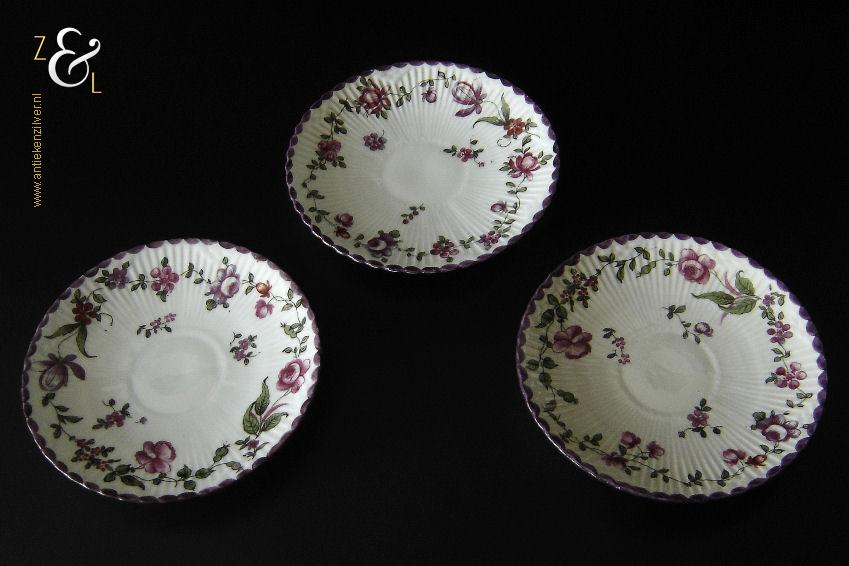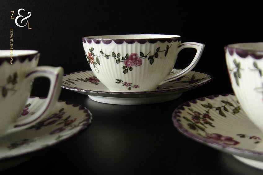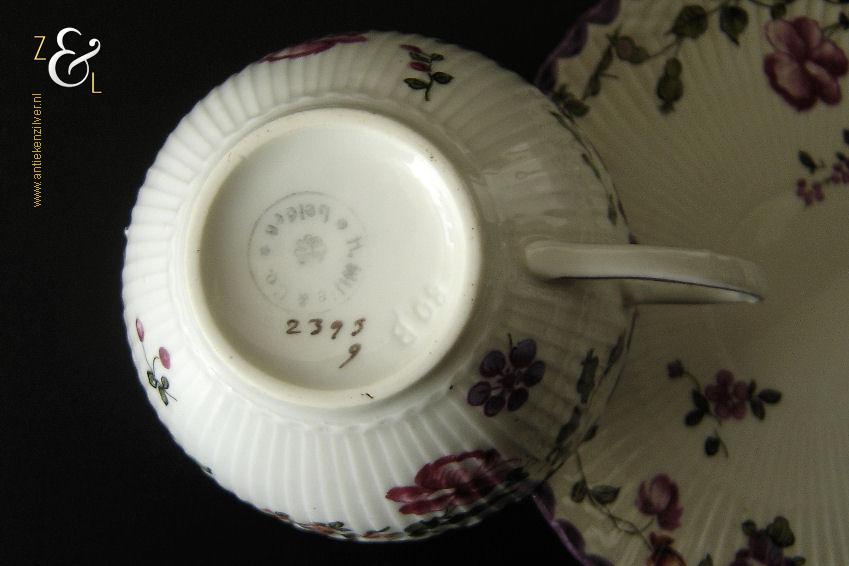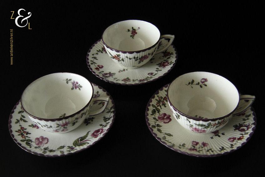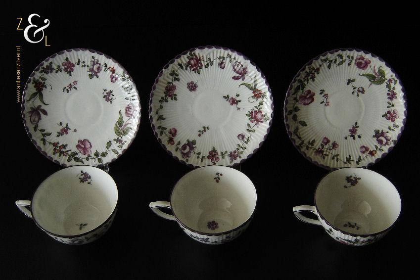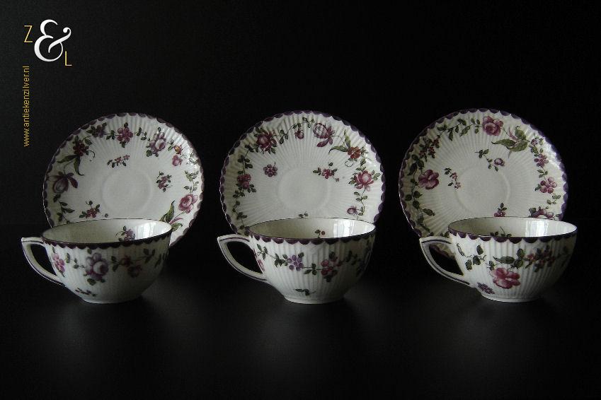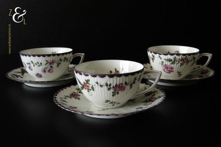 Deze drie kop en schotels zijn verkocht door H. Wille & Co. een winkel gespecialiseerd in de verkoop van galanterieën, pendules, glas en porselein die omstreeks 1880 gevestigd was op de Nieuwendijk 184 in Amsterdam. De porseleinen kop en schotels zijn aan het begin van de 20e eeuw omstreeks 1900 gemaakt en zijn op de hand beschilderd met verschillende decors van bloemen. De kop en schotels zijn met uitzondering van één schotel aan de onderzijde gemerkt met het ronde stempel van H. Wille & Co met daaronder Leiden, het modelnummer 2393 en het blindmerk 80 B. De kopjes zijn 4.7 cm hoog, hebben een diameter van 8.4 cm en zijn inclusief oor gemeten 10.5 cm breed. De schotels hebben een diameter van 13.7 cm en zijn 1.5 cm hoog. Één schotel met daarop één kopje meet 5.2 cm hoog. De drie kop en schotels wegen samen 453 gram. De drie kop en schotels waarvan het model onderling iets afwijkt hebben héél lichte gebruikssporen.