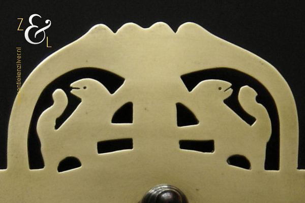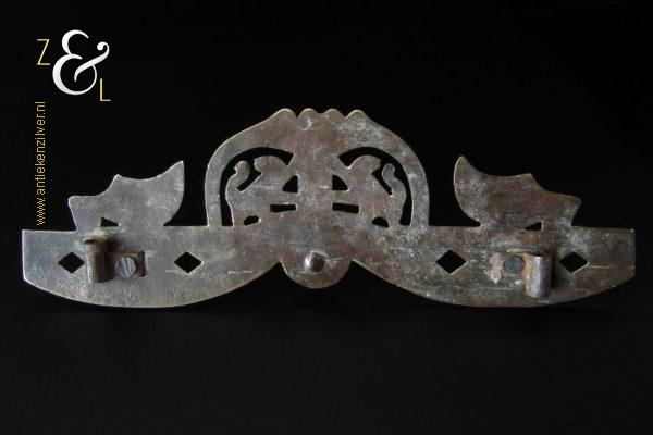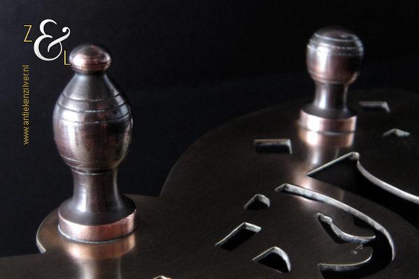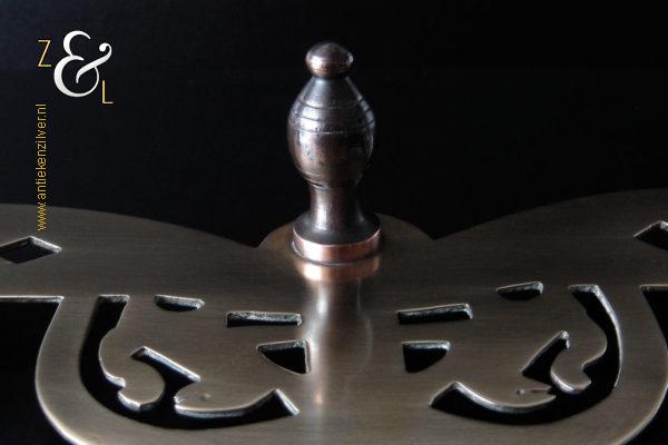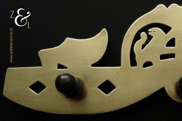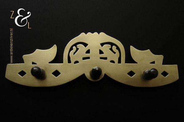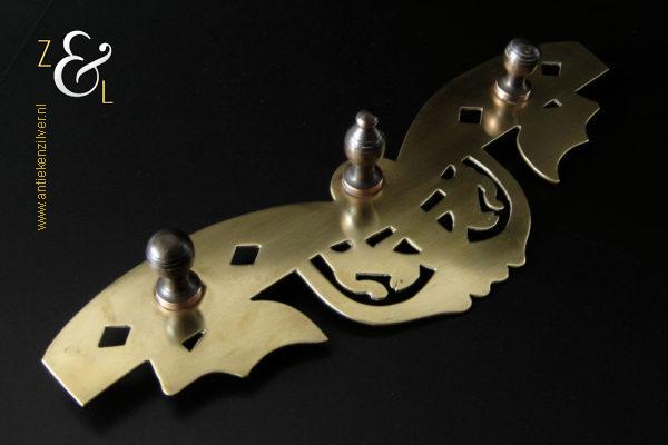 Dit kapstokje / wandrekje model klomp en eekhoorn is gemaakt in Nederland en stamt uit de tweede helft van de 19e eeuw. Het op de hand gemaakte kapstokje / wandrekje is uitgevoerd in zijdeglans messing en heeft drie massief gegoten koperen knoppen die de nog oude antieke donkere patina hebben. De middelste knop is 5 cm lang en de buitenste knoppen zijn 3.7 cm lang. Tevens heeft het kapstokje / wandrekje aan de achterzijde twee ijzeren ophangbeugels voor bevestiging aan de muur. Het kapstokje / wandrekje weegt 738 gram en is 36.8 cm lang bij 11.6 cm breed.