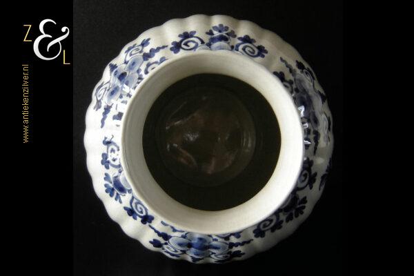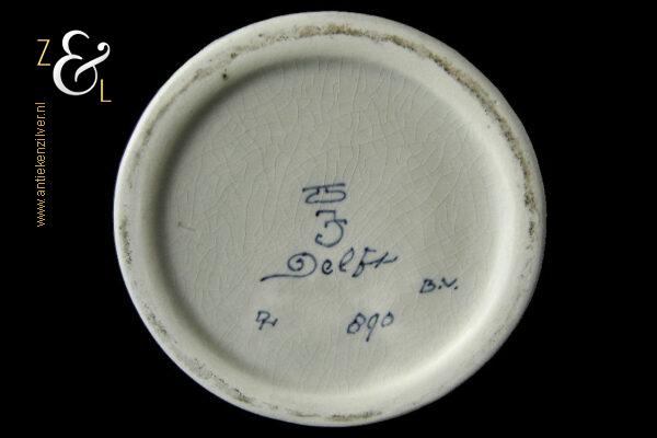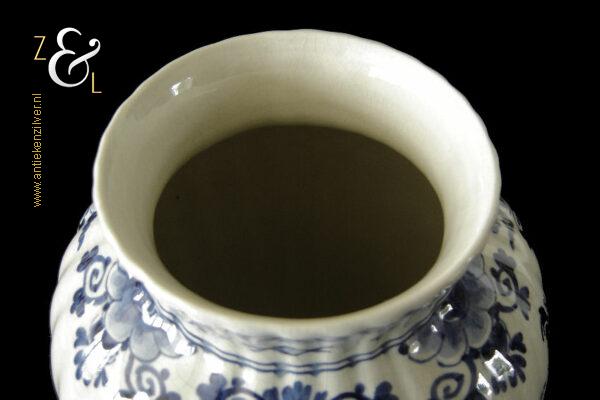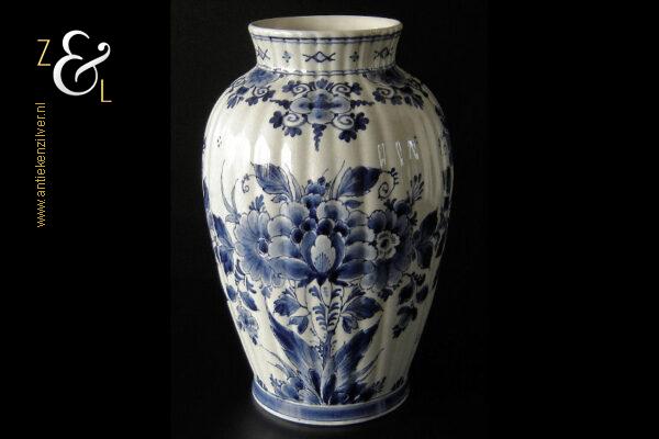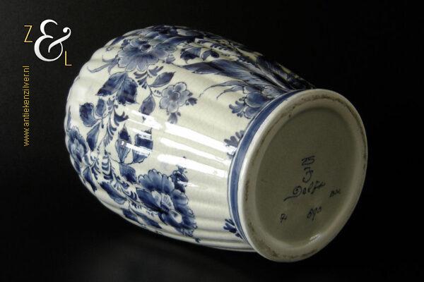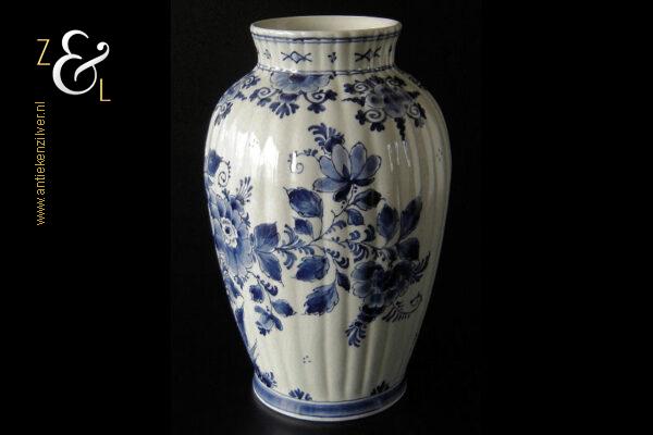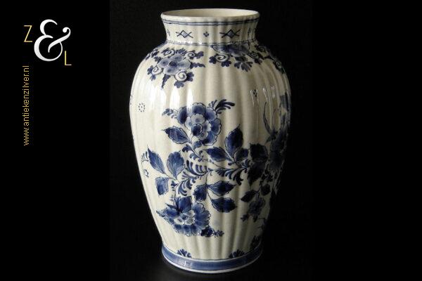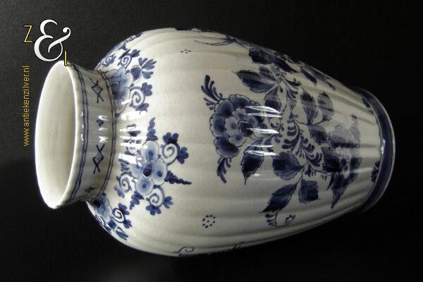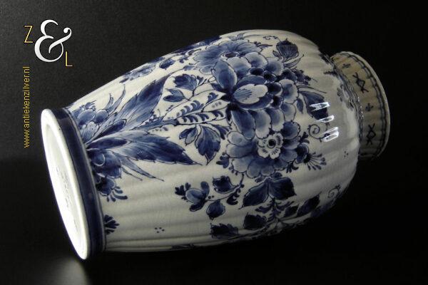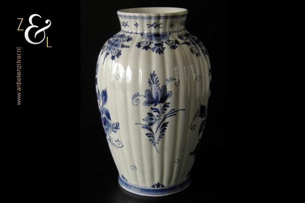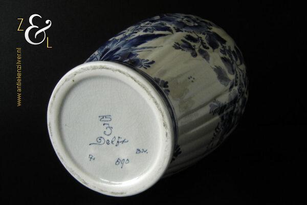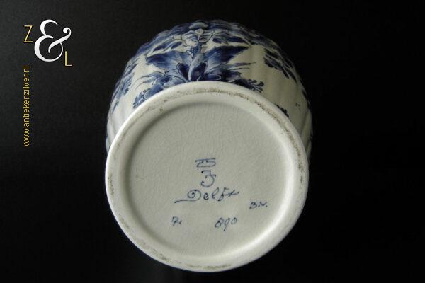 Deze vaas / ribbelvaas is gemaakt in Delft bij de aardewerkfabriek De Porceleyne Fles / Royal Delft. De op de hand gemaakte en beschilderde tinglazuur / onderglazuur aardewerk vaas is rondom voorzien van een kobaltblauw-wit decor met de afbeelding van florale motieven. De vaas is aan de onderzijde met de kleur blauw gesigneerd en gecodeerd met: bovenaan een apothekersflesje, daaronder de initialen JT, van Joost Thooft (eigenaar van het bedrijf in 1876) en daaronder Delft. Onder het merk staat links het monogram van de schilder: een ineengevlochten D en N voor D.R. v.d. Niet, in dienst van 1949 tot en met 1959 rechts: de jaarcode B.V. voor 1951 en middenonder: het modelnummer 890. De vaas weegt 1309 gram is 25.7 cm hoog en heeft een diameter van 16.5 cm. De opening aan de bovenzijde heeft een diameter van 9.7 cm en de voet heeft een diameter van 11 cm. De vaas heeft héél lichte gebruikssporen en een egale craquelé.