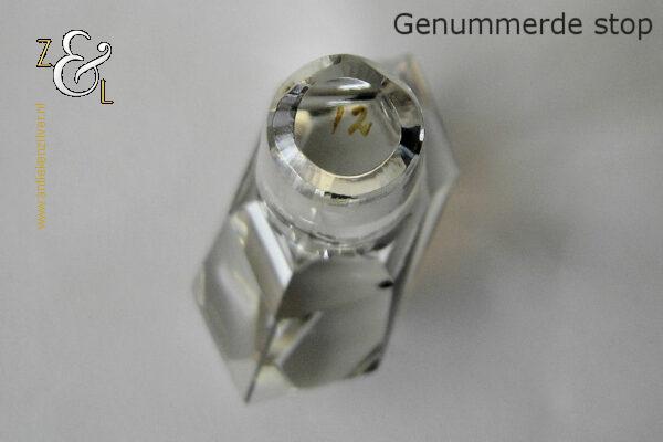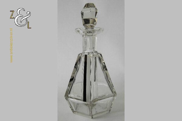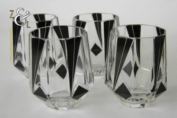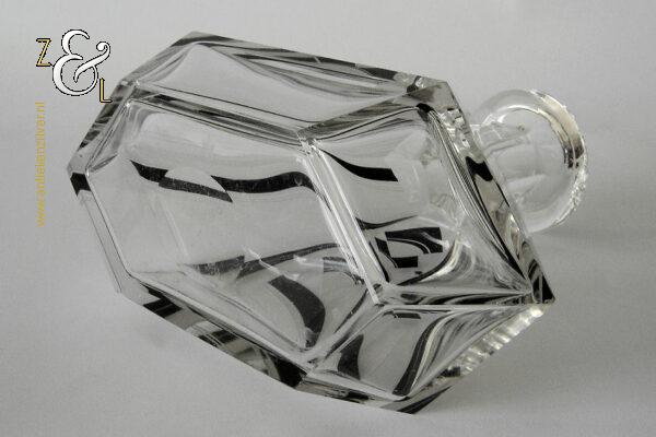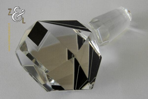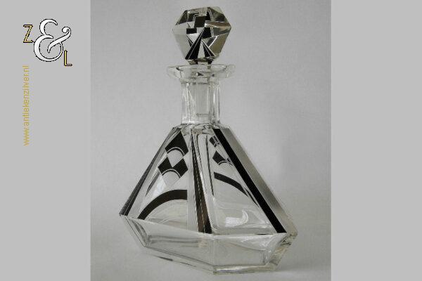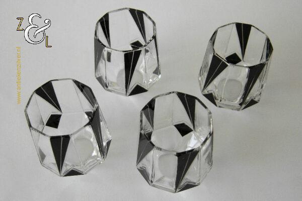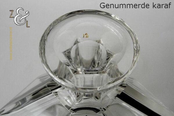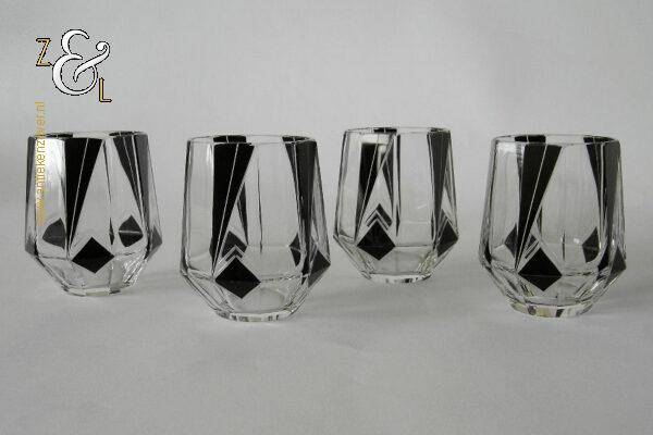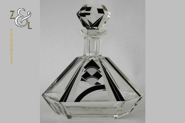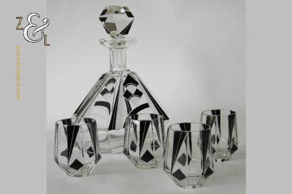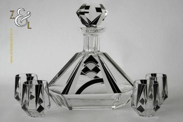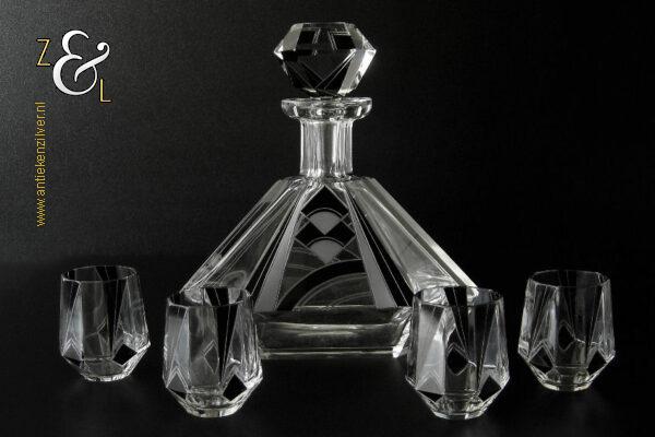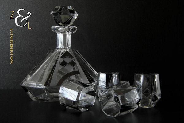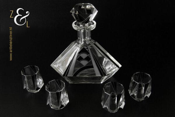 Deze karaf en 4 glazen zijn gemaakt in Tsjechië – Bohemen bij de Firma Karl Palda en stammen uit de Art Deco periode (omstreeks 1930). De in hoogwaardig helder kristal uitgevoerde karaf en glazen zijn op de hand symmetrisch facetgeslepen, gepolijst en geometrisch zwart geëtst. De karaf en stop zijn genummerd (12) en aan de onderzijde heeft de karaf een in de vorm van een lens weggeslepen pontilmerk (zie afbeeldingen met geel omkaderde gedeeltes). De karaf en 4 glazen wegen samen 1390 gram. De tienkantige glazen hebben een diameter van 5.5 cm en zijn 6 cm hoog, de karaf is 19.5 cm lang bij 9.5 cm breed bij 20.7 cm hoog. De karaf en glazen hebben lichte gebruikssporen. De karaf heeft een héél lichte aanslag onderin de karaf (zie afbeelding).