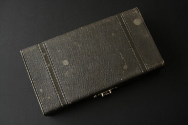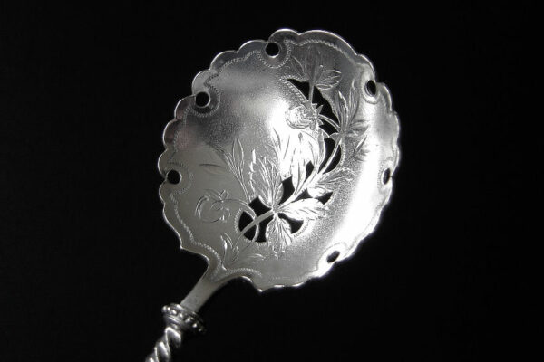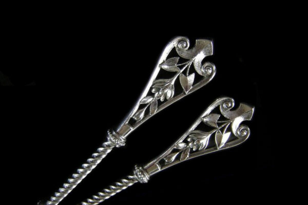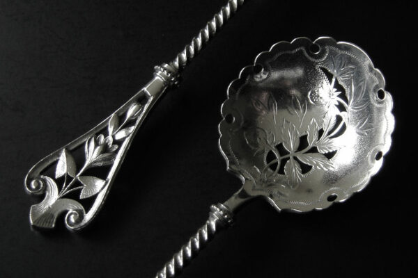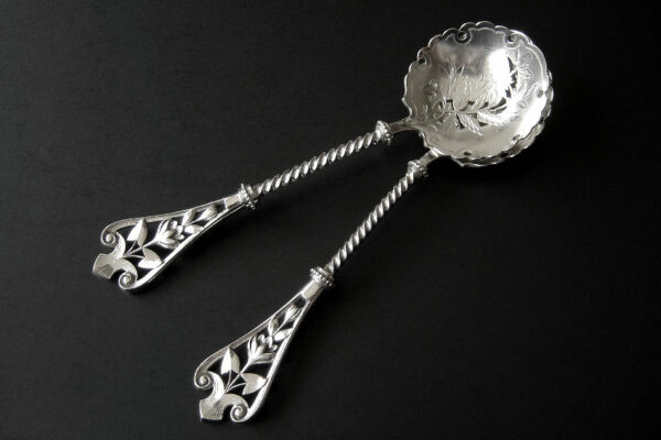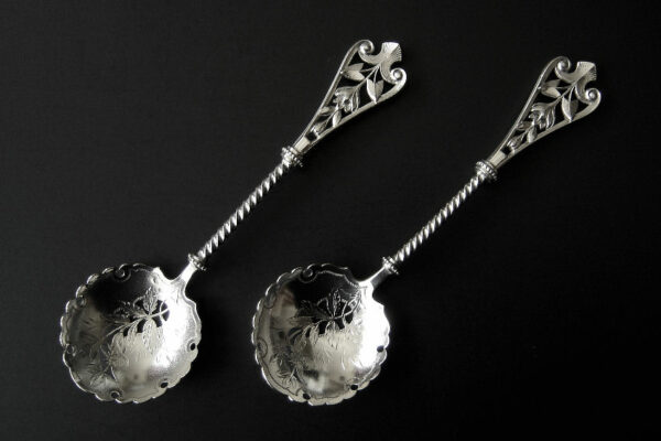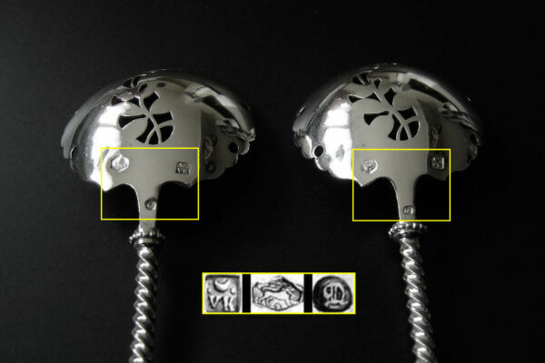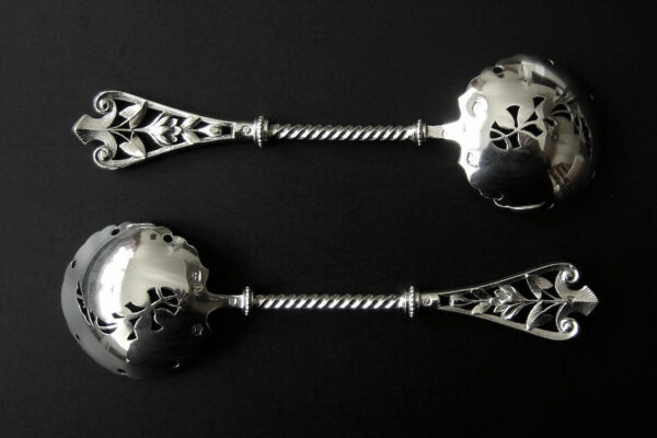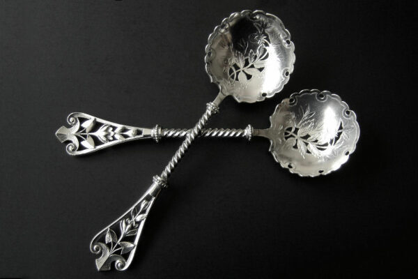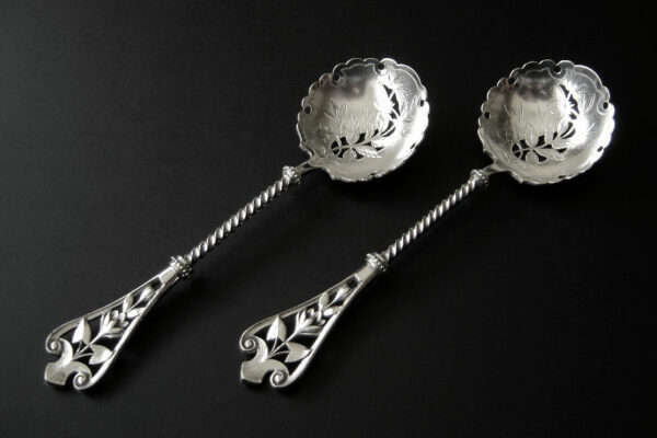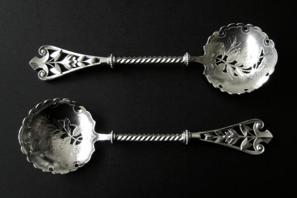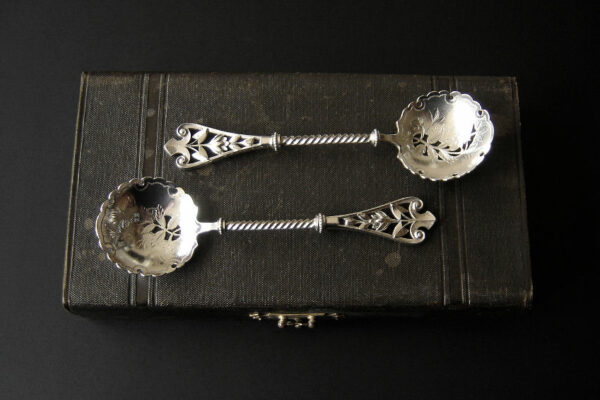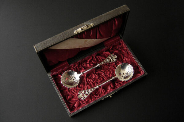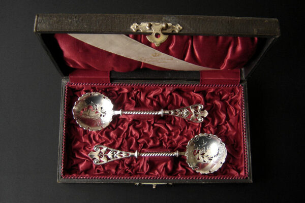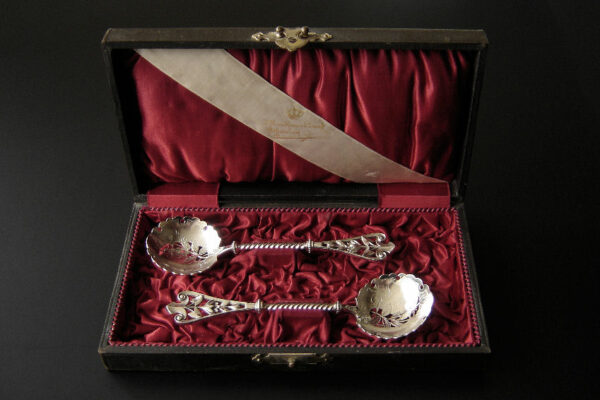 Dit stel natfruitlepels / aardbeienlepels is gemaakt in Voorschoten door de Firma J.M. van Kempen & Zonen (meesterteken liggend maantje tussen punten boven VK in vierkant) in het jaar 1900 (jaarletter Q). De zware zilveren Art Nouveau natfruitlepels / aardbeienlepels hebben getordeerde stelen en gegoten handgrepen. De bakken zijn gematteerd, uitgezaagd en gegraveerd met een aardbeien motief (matteren is een bewerking waarbij de zilversmid het oppervlak van een zilveren voorwerp een matte structuur geeft). Het stel natfruitlepels / aardbeienlepels heeft het originele zwarte foedraal dat aan de binnenzijde een rood zijden en geplooid velours interieur heeft. Aan de binnenkant van het deksel is op een wit zijden lint in glanzend goud gedrukt: J.M. van Kempen & Zonen Hofjuweliers met daarboven een kroon. Het foedraal heeft gebruikssporen: de bovenkant van het deksel heeft vlekken / spetters (zie afbeelding). De lepels wegen 84 gram zijn 16 cm lang en hebben een bak met een diameter van 4.6 cm. Het foedraal is 22.4 cm lang bij 12.2 breed bij 3.9 cm hoog.