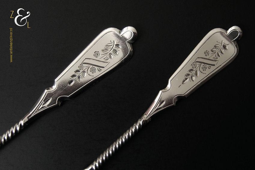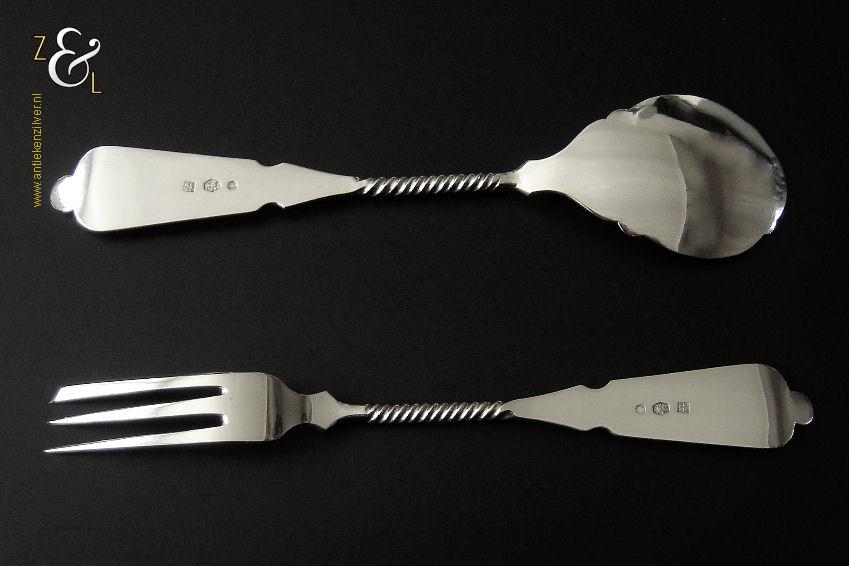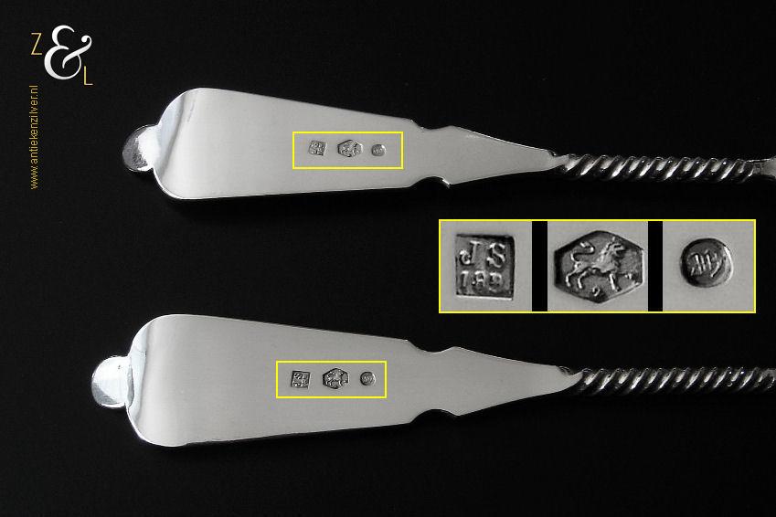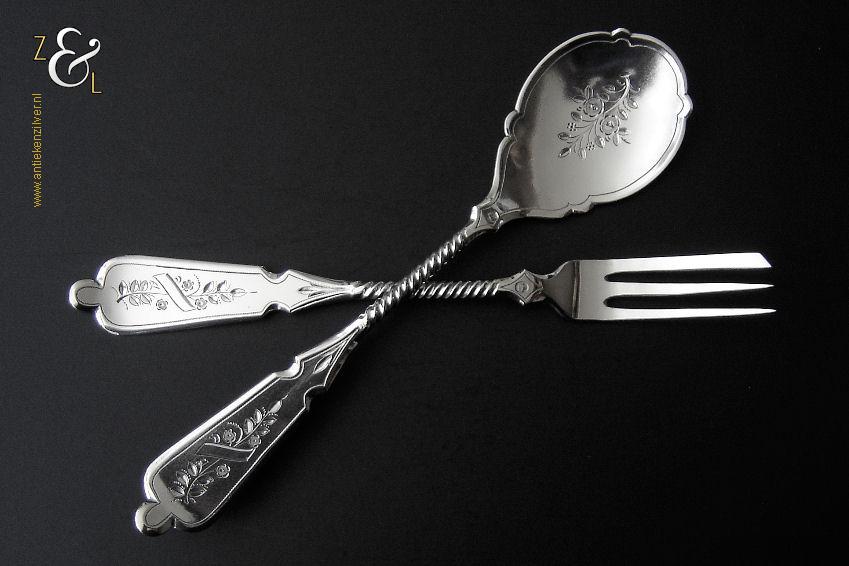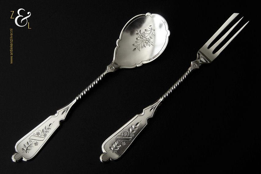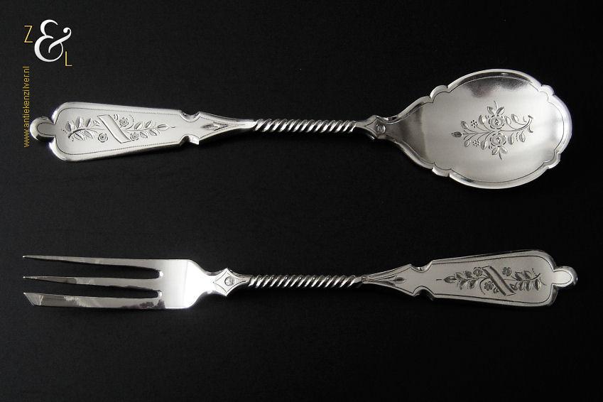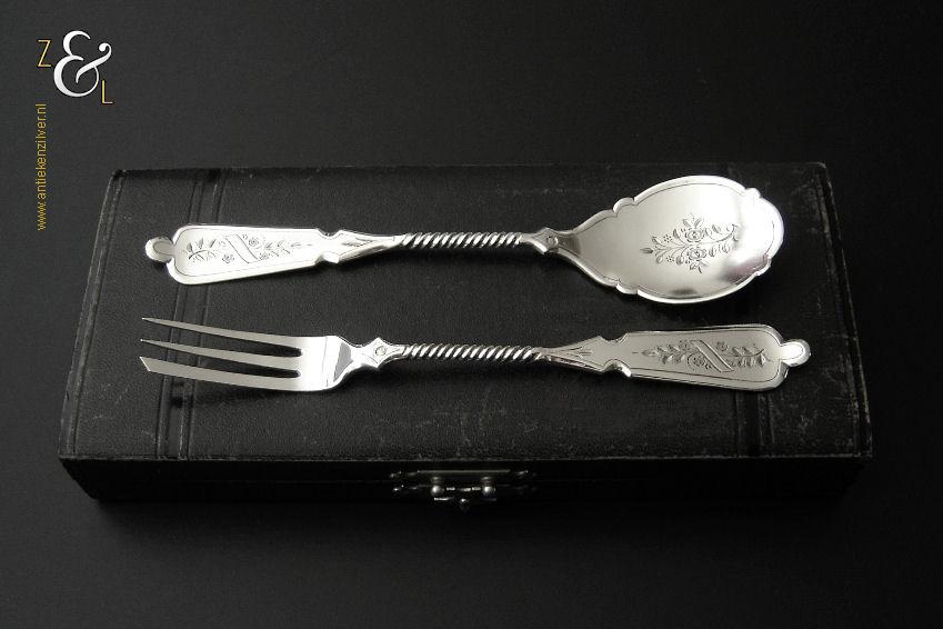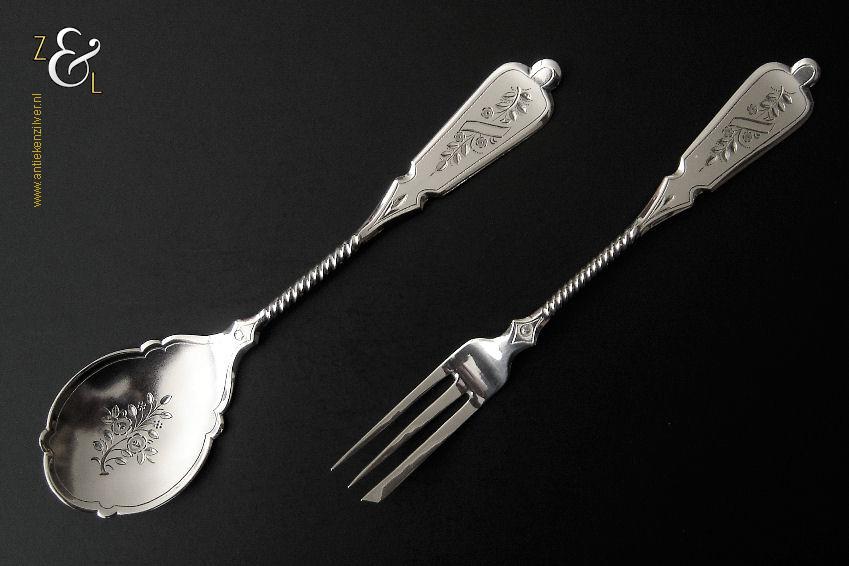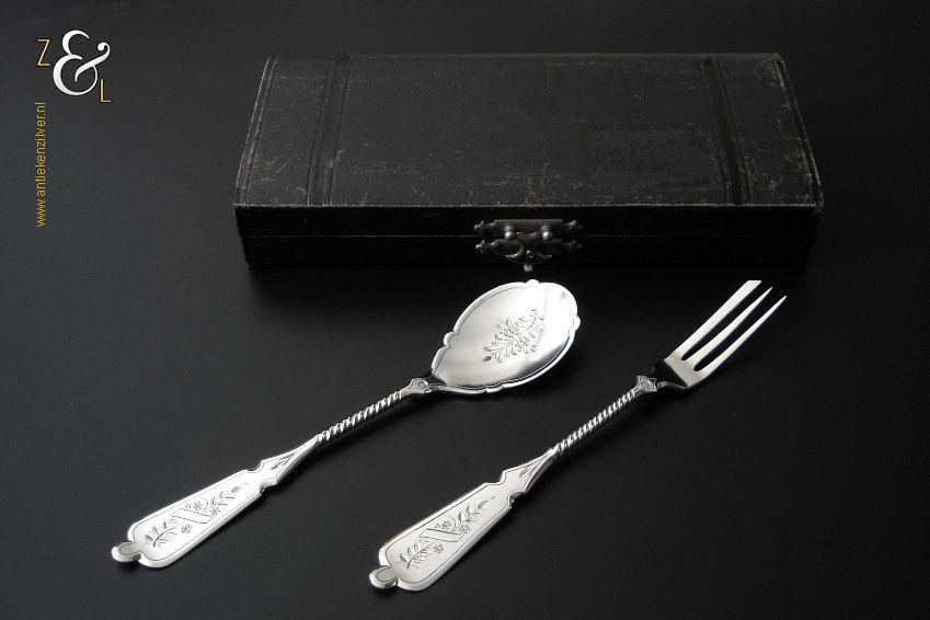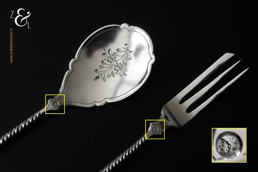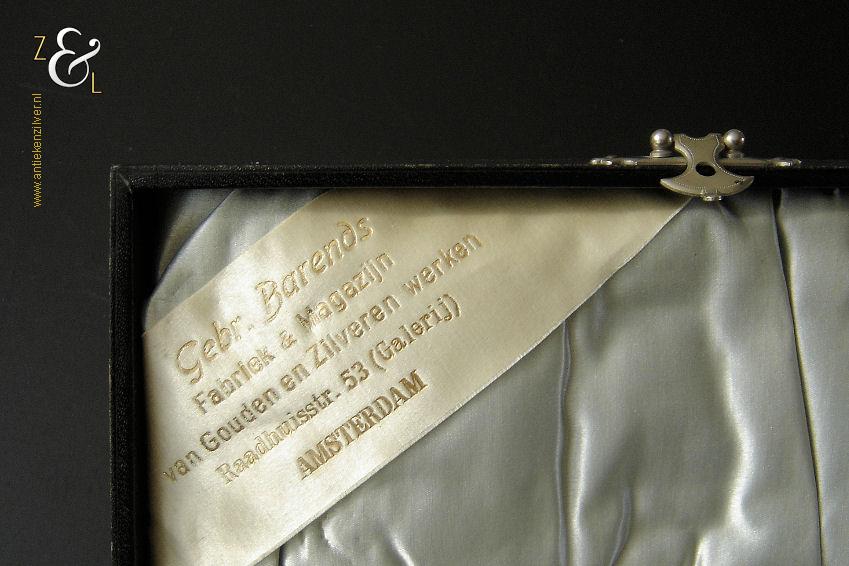Gembercouvert gemaakt in Woudsend / Sneek door Johannes Schijfsma (meesterteken JS boven 189 in vierkant) in het jaar 1896 (jaarletter M). Het gembercouvert heeft het originele zwarte foedraal (heeft lichte gebruikssporen) dat aan de binnenzijde een lichtblauw geplooid zijden interieur heeft. Aan de binnenkant van het deksel is op een wit zijden lint in glanzend goud gedrukt: Gebr. Barends Fabriek & Magazijn van Gouden en Zilveren werken Raadhuisstr. 53 (Galerij) Amsterdam (de verkopende winkelier). Het in Jugendstil uitgevoerde zilveren gembercouvert heeft getordeerde stelen en de bak van de lepel en de handgrepen hebben een gravering van bloemmotieven en zijn gematteerd (matteren is een bewerking waarbij de zilversmid het oppervlak van een zilveren voorwerp een matte structuur geeft). Het gembercouvert weegt 72 gram is 18.1 cm lang en de lepelbak is 7 cm lang bij 4.2 cm breed. Het foedraal is 22 cm lang bij 9.5 cm breed bij 3.5 cm hoog.