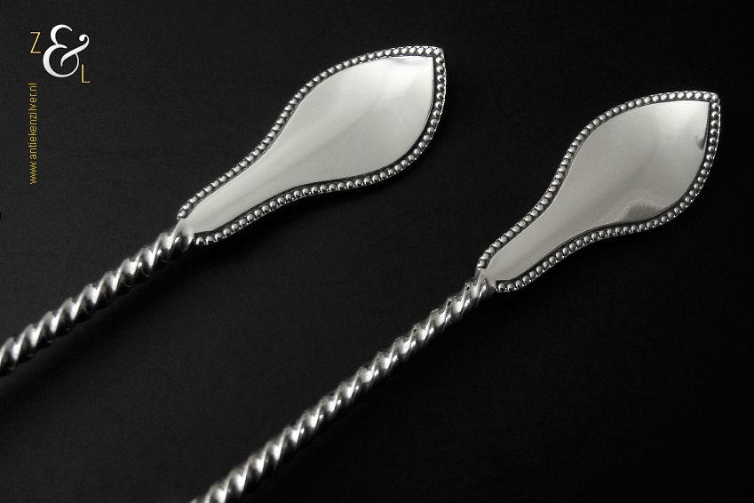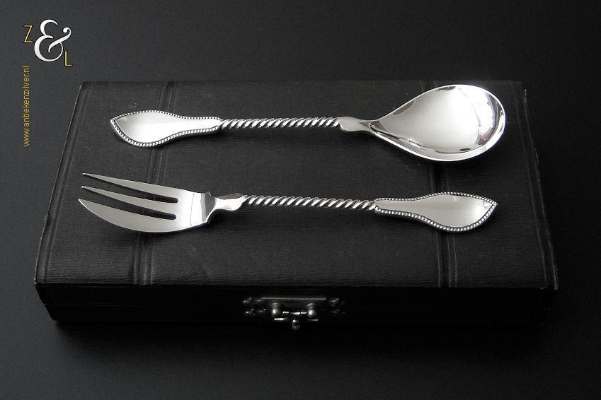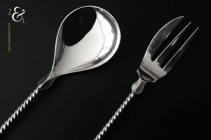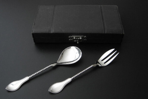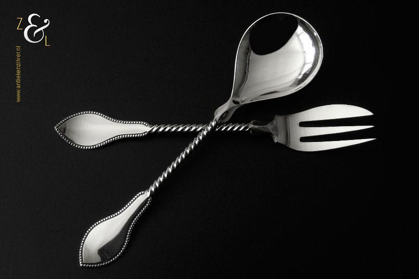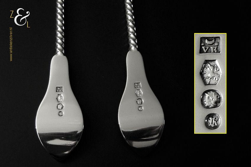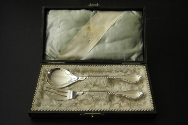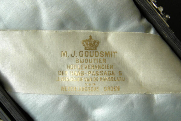 Gembercouvert gemaakt in Voorschoten door de Firma J.M. van Kempen & Zonen (meesterteken liggend maantje tussen punten boven VK in vierkant) in het jaar 1901 (jaarletter R). Het gembercouvert heeft het originele zwarte foedraal (heeft lichte gebruikssporen) en is aan de binnenzijde van het deksel gestoffeerd met lichtblauwe zijde en een wit zijden lint met in glanzend goud gedrukt: M.J. Goudsmit Bijoutier Hofleverancier Den Haag Passage 6 Leverancier van de Kanselarij der Nederlandsche Orden met daarboven een kroon (de verkopende winkelier). Verder heeft het foedraal aan de onderzijde waarin het gembercouvert geklemd zit een gebroken wit geplooid mohair interieur. Het zilveren gembercouvert waarvan de stelen getordeerd zijn heeft handgrepen die uitgevoerd zijn in model parelrand. Het gembercouvert weegt 80 gram is 17 cm lang en de lepelbak is 6 cm lang bij 4.3 cm breed. Het foedraal is 20.5 cm lang bij 11.2 breed bij 3.5 cm hoog.