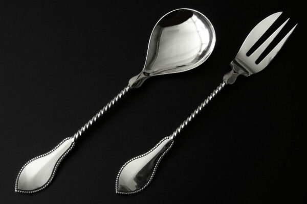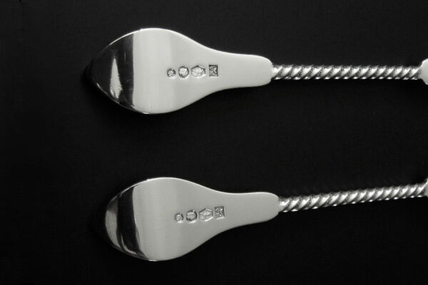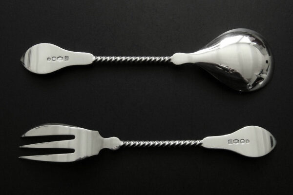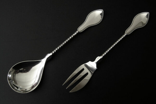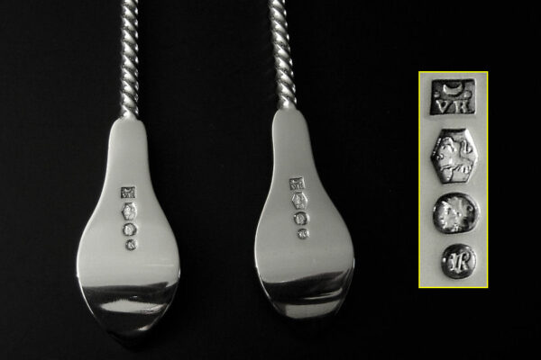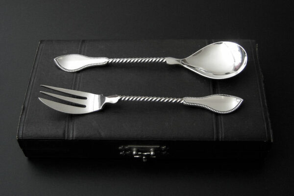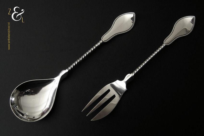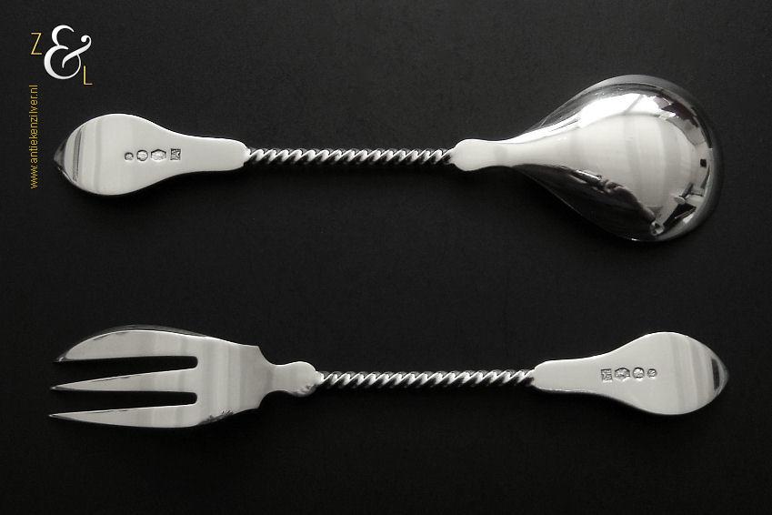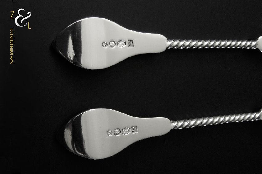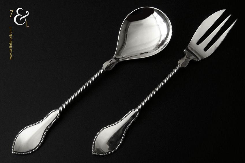 Gembercouvert gemaakt in Voorschoten door de Firma J.M. van Kempen & Zonen (meesterteken liggend maantje tussen punten boven VK in vierkant) in het jaar 1901 (jaarletter R). Het gembercouvert heeft het originele zwarte foedraal (heeft lichte gebruikssporen) en is aan de binnenzijde van het deksel gestoffeerd met lichtblauwe zijde en een wit zijden lint met in glanzend goud gedrukt: M.J. Goudsmit Bijoutier Hofleverancier Den Haag Passage 6 Leverancier van de Kanselarij der Nederlandsche Orden met daarboven een kroon (de verkopende winkelier). Verder heeft het foedraal aan de onderzijde waarin het gembercouvert geklemd zit een gebroken wit geplooid mohair interieur. Het zilveren gembercouvert waarvan de stelen getordeerd zijn heeft handgrepen die uitgevoerd zijn in model parelrand. Het gembercouvert weegt 80 gram is 17 cm lang en de lepelbak is 6 cm lang bij 4.3 cm breed. Het foedraal is 20.5 cm lang bij 11.2 breed bij 3.5 cm hoog.