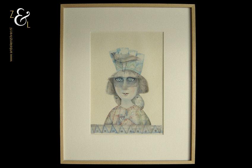Deze reproductie / litho met de titel “Gebed” is gemaakt door Jan Toorop. De mystiek- religieus ingekleurde reproductie heeft het nog originele met hout gefineerde passe partout en is linksboven in de druk gesigneerd en gedateerd: J. Toorop met daaronder het jaar 1924 en daaronder de titel: Gebed. De reproductie is aan de binnenzijde van het passe partout gemeten 26 cm lang bij 22 cm breed. De buitenzijde van het passe partout is 38.5 cm lang bij 35.5 cm breed. Van de reproductie is de oude beschadigde lijst verwijderd en in het blauw is een klein vlekje geretoucheerd (zie geel omkaderd gedeelte op afbeelding).